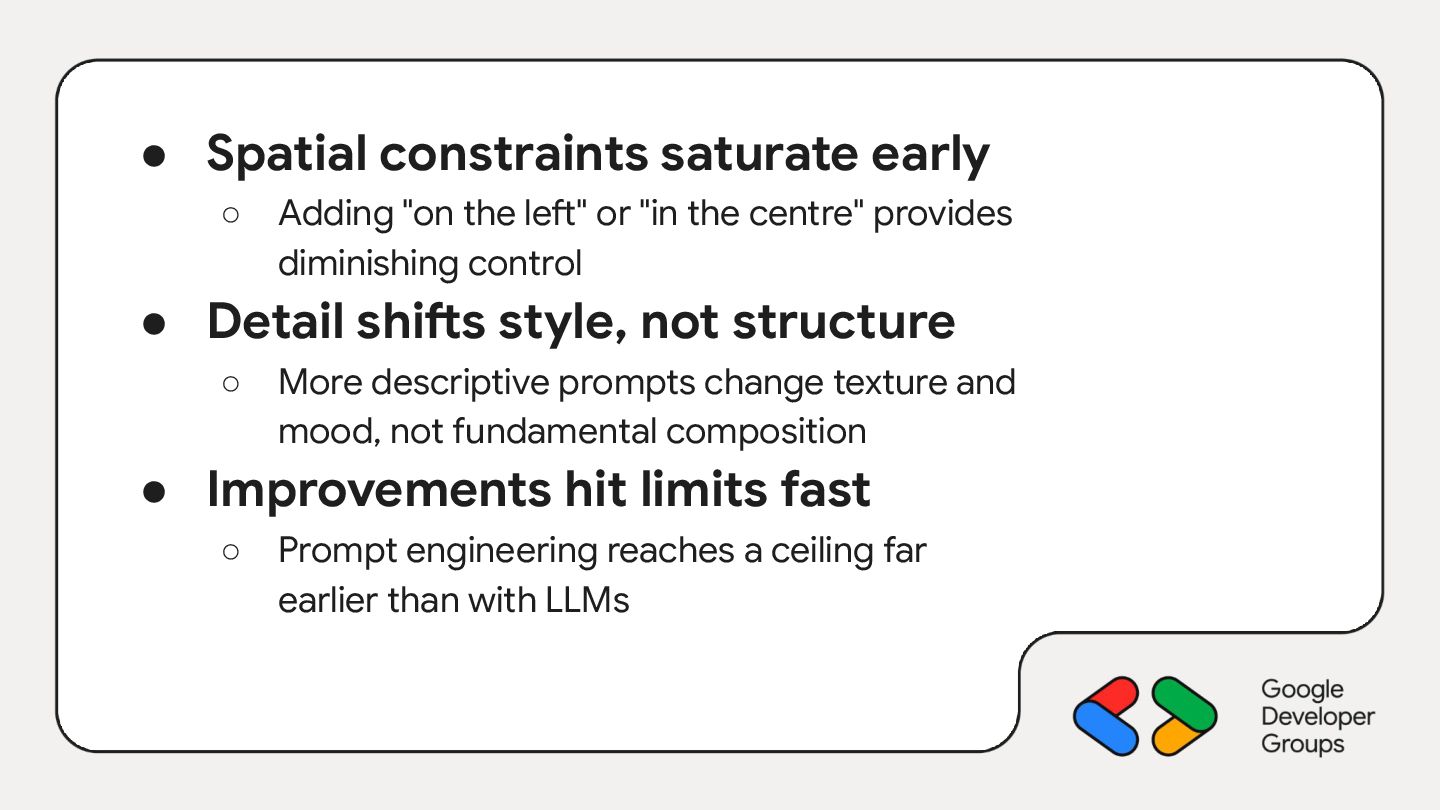 or "in the centre" provides diminishing control • Detail shifts style, not structure ◦ More descriptive prompts change texture and mood, not fundamental composition • Improvements hit limits fast ◦ Prompt engineering reaches a ceiling far earlier than with LLMs