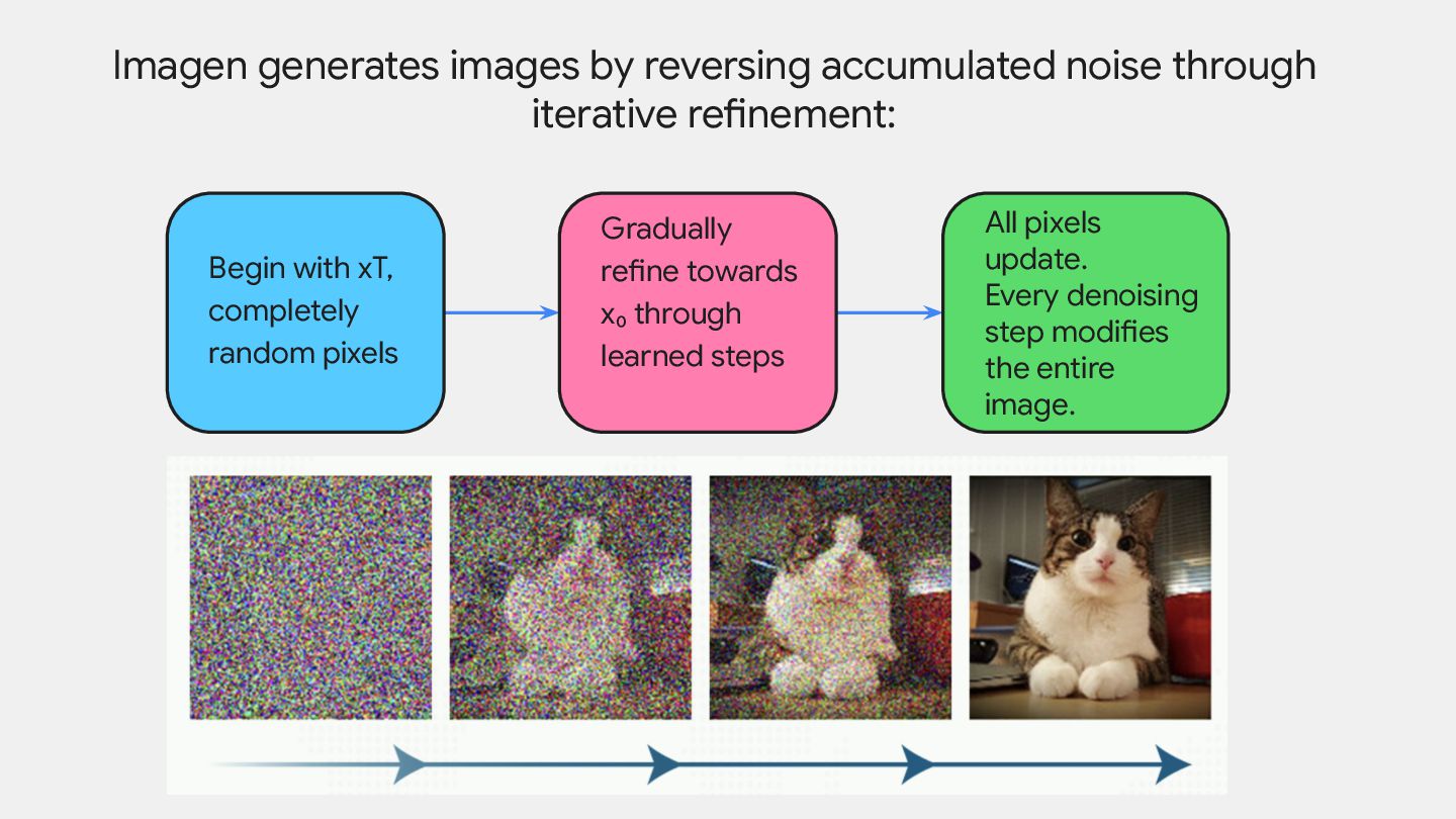 through learned steps All pixels update. Every denoising step modifies the entire image. Imagen generates images by reversing accumulated noise through iterative refinement: