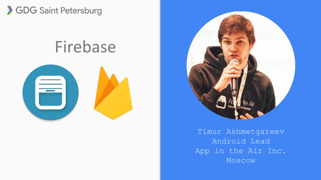 Android разработчик в App in the Air. Одними из первых выпустили Android Wear приложения, получили звание Top Developer, многократно появлялись в категории Лучшее из России. Проект участвовал в бета-тестировании Firebase за три месяца до релиза, наша команда в числе 10 других презентовала результаты нашей работы с продуктом в Калифорнии по приглашению Google. Про наш опыт c Firebase рассказывали на Google I/O.