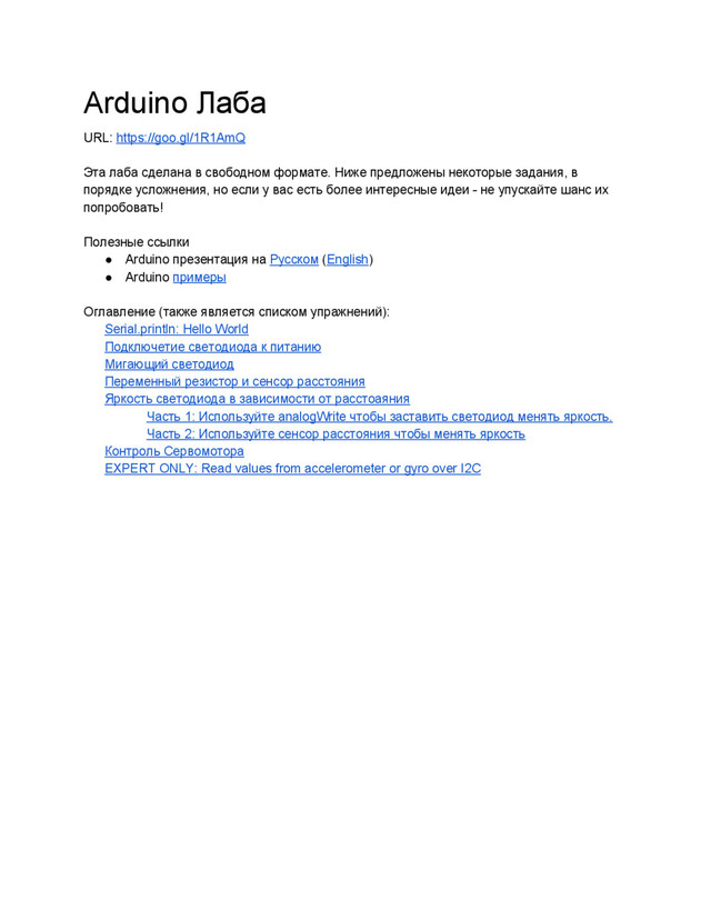 чтобы заставить светодиод менять яркость. Можете использовать этот пример: void setup() { pinMode(3, OUTPUT); } byte brightness = 0; // 0 to 255 void loop() { analogWrite(3, brightness); brightness++; delay(2); } Внимание, не все контакты поддерживают PWM. Те что поддерживают: • Arduino Nano: 3, 5, 6, 9, 10, 11. • Arduino Micro: 3, 5, 6, 9, 10, 11, 13 Часть 2: Используйте сенсор расстояния чтобы менять яркость Должно быть очевидно как это сделать на основе предыдущих примеров. Учтите что analogRead возвращает значения от 0 до 1023 (10 бит), тогда как analogWrite принимает значения от 0 до 256. Чтобы преобразовать значение, можно использовать функцию map, или просто обычное деление. Также, значение возвращаемое сенсором расстояния может содержать шум вблизи нуля (т.е. возвращать не 0, а небольшое произвольное значение). Чтобы избавиться от этого эффекта, можете добавить код типа: short val = analogRead(A0); if (val < 20) { val = 0; } или: short val = analogRead(A0); val = 20; if (val < 0) { val = 0;