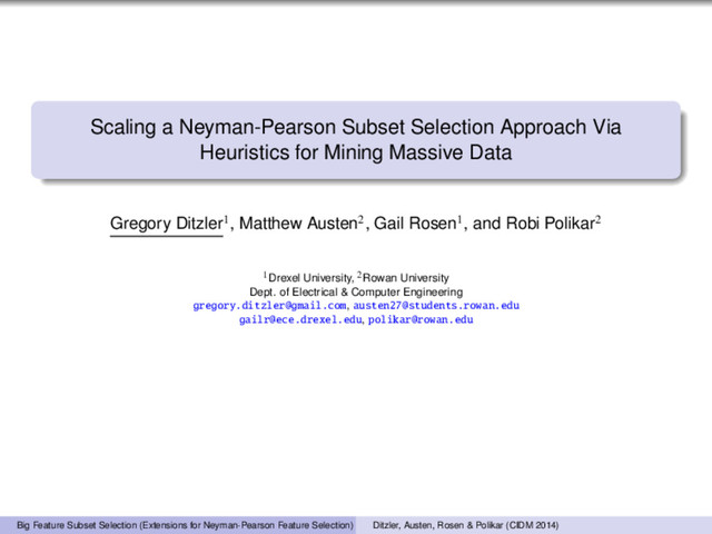 Award #1310496. Any opinions, findings, and conclusions or recommendations expressed in this material are those of the author(s) and do not necessarily reflect the views of the National Science Foundation. Big Feature Subset Selection (Extensions for Neyman-Pearson Feature Selection) Ditzler, Austen, Rosen & Polikar (CIDM 2014)