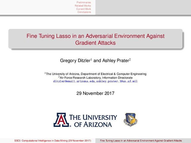 Learning in Nonstationary Environments Concept drift Concept drift can be modeled as a change in a probability distribution, P(X, Ω). The change can be in P(X), P(X|Ω), P(Ω), or joint changes in P(Ω|X). P(Ω|X) = P(X|Ω)P(Ω) P(X) We generally reserve names for specific types of drift (e.g., real and virtual) Drift types: sudden, gradual, incremental, & reoccurring General Examples: electricity demand, financial, climate, epidemiological, and spam (to name a few) NSE and Traditional Classification Algorithms Many traditional learning algorithms assume that data are sampled i.i.d. (CART, Adaboost, etc); however, rarely is that the case Learning in NSE generally requires that the drift in the stream is “structured”. E.g., there is some common information between the different data sets in the stream 1G. Ditzler, M. Roveri, C. Alippi, and R. Polikar, “Adaptive strategies for learning in nonstationary environments: a survey,” IEEE Computational Intelligence Magazine, 2015, vol. 10, no. 4, pp. 12–25. 2G. Ditzler, G. Rosen, and R. Polikar, “Domain Adaptation Bounds for Multiple Expert Systems Under Concept Drift,” International Joint Conference on Neural Networks, 2014. (best student paper award) SSCI: Computational Intelligence in Data Mining (29 November 2017) Fine Tuning Lasso in an Adversarial Environment Against Gradient Attacks