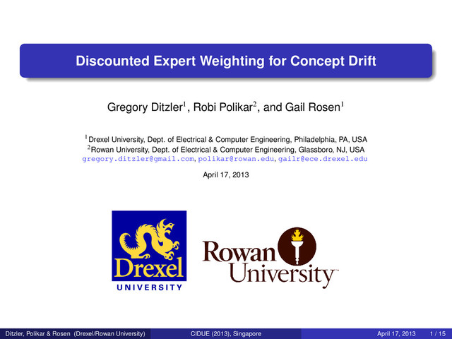 National Science Foundation [#0845827], [#1120622], and the Department of Energy Award [#SC004335]. Robi Polikar is supported by the National Science Foundation [ECCS-0926159]. Ditzler, Polikar & Rosen (Drexel/Rowan University) CIDUE (2013), Singapore April 17, 2013 15 / 15