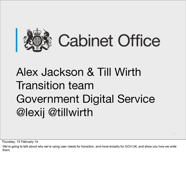 February 14 GDS design principle #1 - Start with needs. There are a few reason why this is a good idea… - people have a need of government as a whole, not of specific departments. Focussing on what the user needs to do helps us to see through the silos of government organisation, and to present information in a joined-up way - people come to government to get something done. Whether that’s to find a piece of information they need, to apply for a driving licence, or to pay their taxes. They don’t come to read things for fun. So the quicker, clearer and simpler we can meet their need, the better. - It’s the need the user has of government, *not* the need government has to impart information to the user. For transition, taking a ‘user-needs first’ approach is helping us and agencies to make sure that we’re creating and transitioning content that works for our users, rather than being a wholesale cut and paste of existing websites. So let’s look at a user need...
