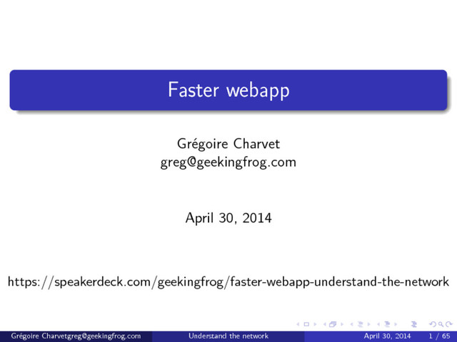 . . . . . . . . . . . . . . . . . . . . . . . . . . . . . . Browser optimizations Modern browsers do a lot of work under the hood to provide better experience. DNS pre-resolve and TCP pre-connect. Speculative optimization. Resources pre-fetching and prioritization. Grégoire [email protected] Understand the network April 30, 2014 49 / 65