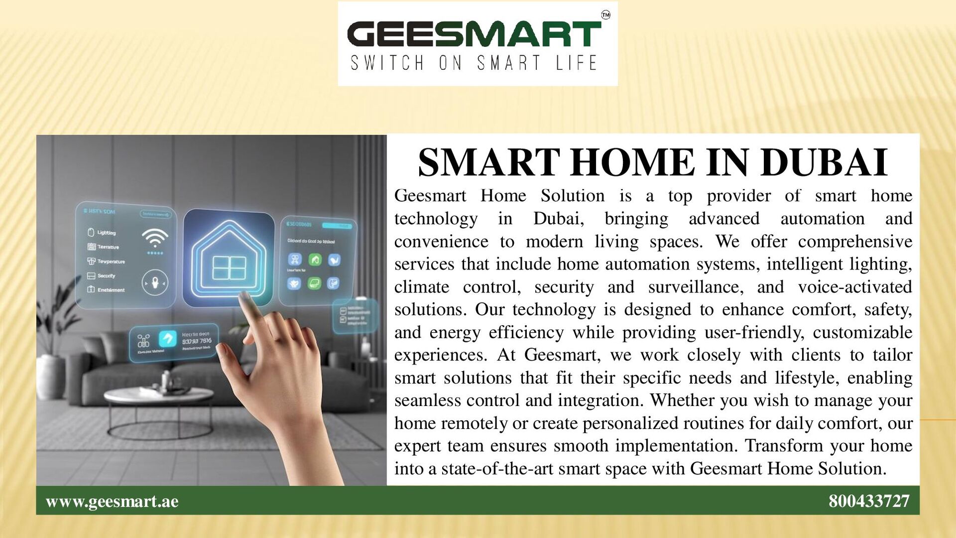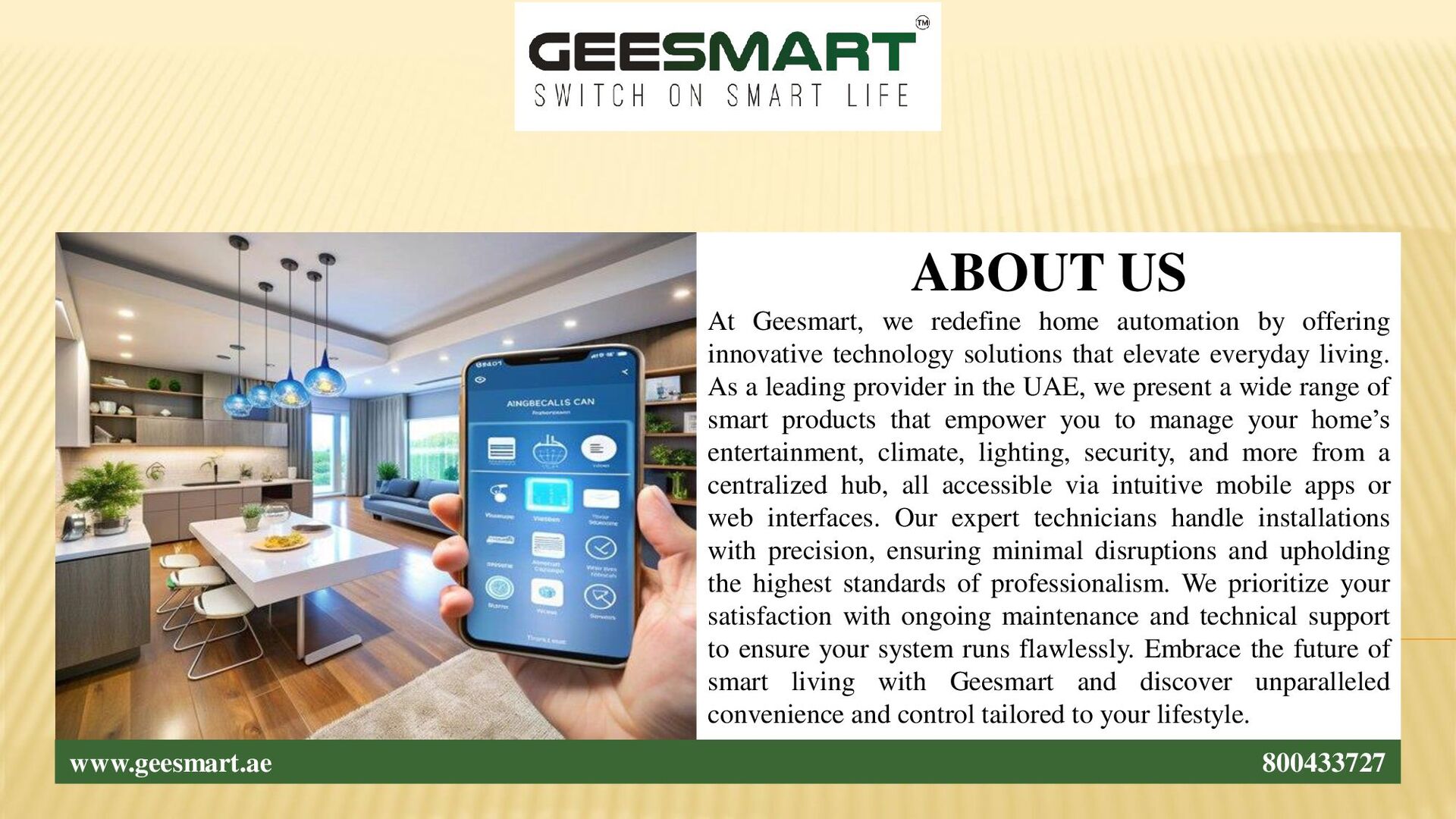smart home technology in Dubai, bringing advanced automation and convenience to modern living spaces. We offer comprehensive services that include home automation systems, intelligent lighting, climate control, security and surveillance, and voice-activated solutions. Our technology is designed to enhance comfort, safety, and energy efficiency while providing user-friendly, customizable experiences. At Geesmart, we work closely with clients to tailor smart solutions that fit their specific needs and lifestyle, enabling seamless control and integration. Whether you wish to manage your home remotely or create personalized routines for daily comfort, our expert team ensures smooth implementation. Transform your home into a state-of-the-art smart space with Geesmart Home Solution. SMART HOME IN DUBAI