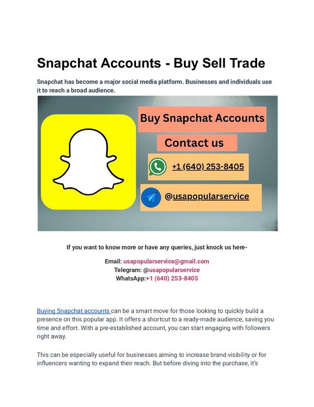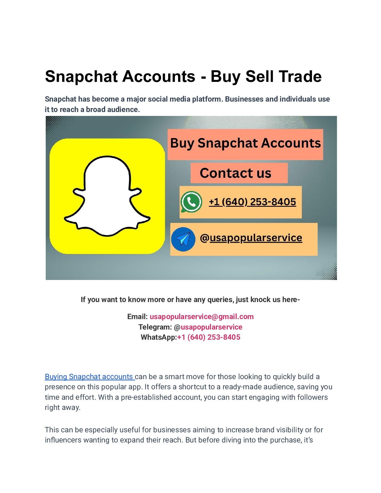 major social media platform. Businesses and individuals use it to reach a broad audience. If you want to know more or have any queries, just knock us here- Email: [email protected] Telegram: @usapopularservice WhatsApp:+1 (640) 253-8405 Buying Snapchat accounts can be a smart move for those looking to quickly build a presence on this popular app. It offers a shortcut to a ready-made audience, saving you time and effort. With a pre-established account, you can start engaging with followers right away. This can be especially useful for businesses aiming to increase brand visibility or for influencers wanting to expand their reach. But before diving into the purchase, it’s