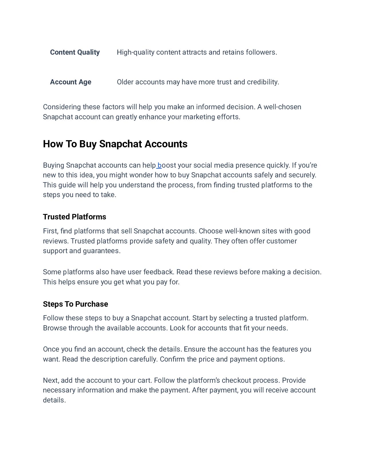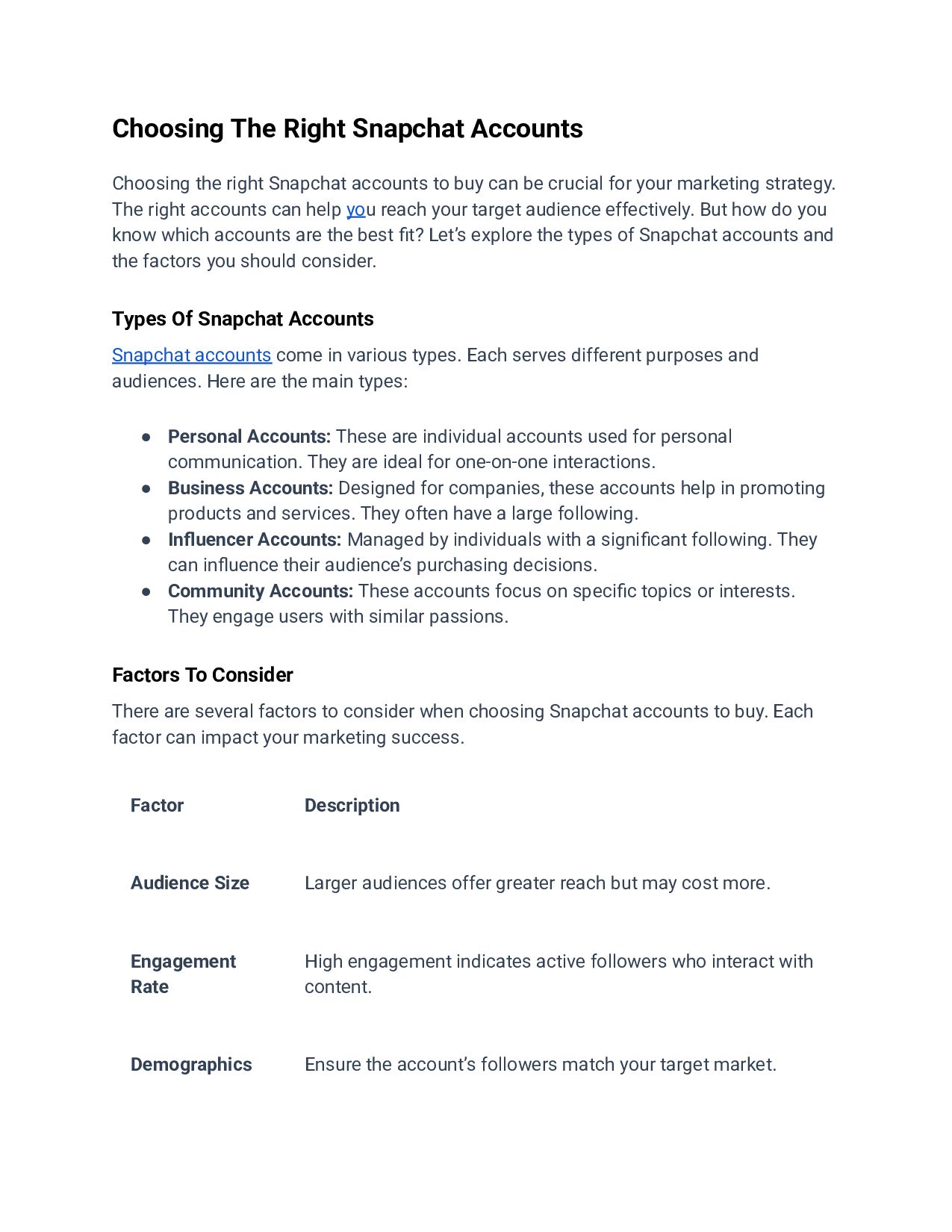 to buy can be crucial for your marketing strategy. The right accounts can help you reach your target audience effectively. But how do you know which accounts are the best fit? Let’s explore the types of Snapchat accounts and the factors you should consider. Types Of Snapchat Accounts Snapchat accounts come in various types. Each serves different purposes and audiences. Here are the main types: • Personal Accounts: These are individual accounts used for personal communication. They are ideal for one-on-one interactions. • Business Accounts: Designed for companies, these accounts help in promoting products and services. They often have a large following. • Influencer Accounts: Managed by individuals with a significant following. They can influence their audience’s purchasing decisions. • Community Accounts: These accounts focus on specific topics or interests. They engage users with similar passions. Factors To Consider There are several factors to consider when choosing Snapchat accounts to buy. Each factor can impact your marketing success. Factor Description Audience Size Larger audiences offer greater reach but may cost more. Engagement Rate High engagement indicates active followers who interact with content. Demographics Ensure the account’s followers match your target market.