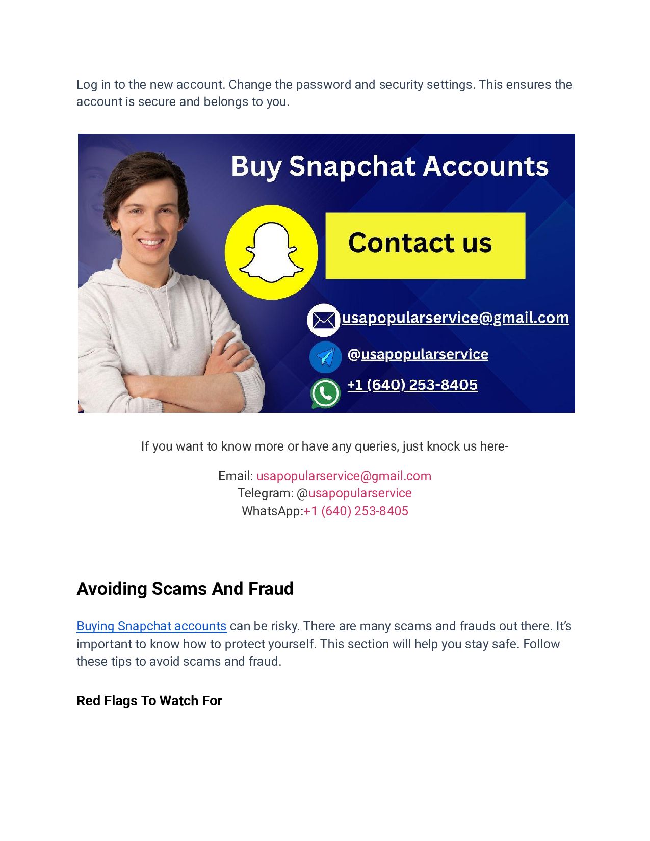 security settings. This ensures the account is secure and belongs to you. If you want to know more or have any queries, just knock us here- Email: [email protected] Telegram: @usapopularservice WhatsApp:+1 (640) 253-8405 Avoiding Scams And Fraud Buying Snapchat accounts can be risky. There are many scams and frauds out there. It’s important to know how to protect yourself. This section will help you stay safe. Follow these tips to avoid scams and fraud. Red Flags To Watch For