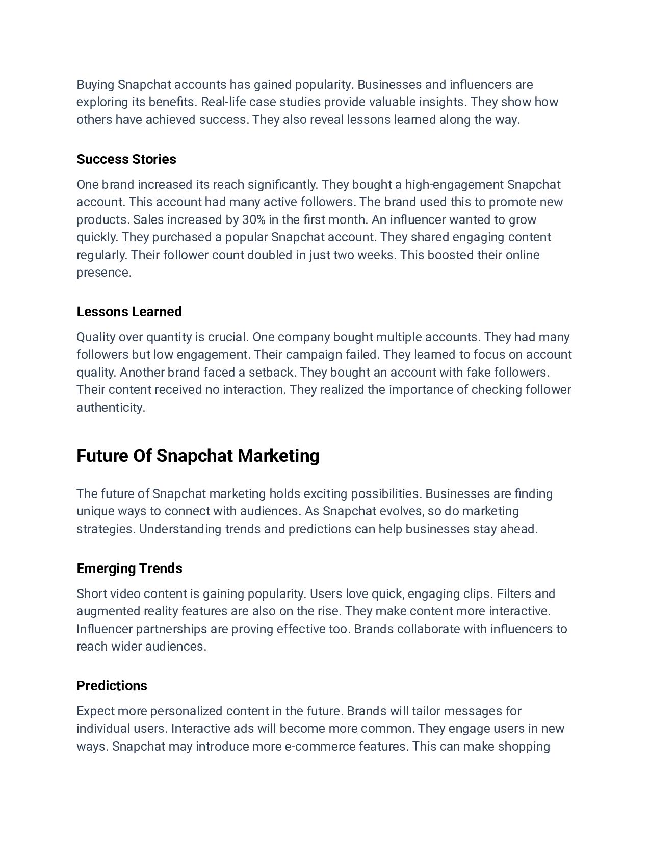 exploring its benefits. Real-life case studies provide valuable insights. They show how others have achieved success. They also reveal lessons learned along the way. Success Stories One brand increased its reach significantly. They bought a high-engagement Snapchat account. This account had many active followers. The brand used this to promote new products. Sales increased by 30% in the first month. An influencer wanted to grow quickly. They purchased a popular Snapchat account. They shared engaging content regularly. Their follower count doubled in just two weeks. This boosted their online presence. Lessons Learned Quality over quantity is crucial. One company bought multiple accounts. They had many followers but low engagement. Their campaign failed. They learned to focus on account quality. Another brand faced a setback. They bought an account with fake followers. Their content received no interaction. They realized the importance of checking follower authenticity. Future Of Snapchat Marketing The future of Snapchat marketing holds exciting possibilities. Businesses are finding unique ways to connect with audiences. As Snapchat evolves, so do marketing strategies. Understanding trends and predictions can help businesses stay ahead. Emerging Trends Short video content is gaining popularity. Users love quick, engaging clips. Filters and augmented reality features are also on the rise. They make content more interactive. Influencer partnerships are proving effective too. Brands collaborate with influencers to reach wider audiences. Predictions Expect more personalized content in the future. Brands will tailor messages for individual users. Interactive ads will become more common. They engage users in new ways. Snapchat may introduce more e-commerce features. This can make shopping