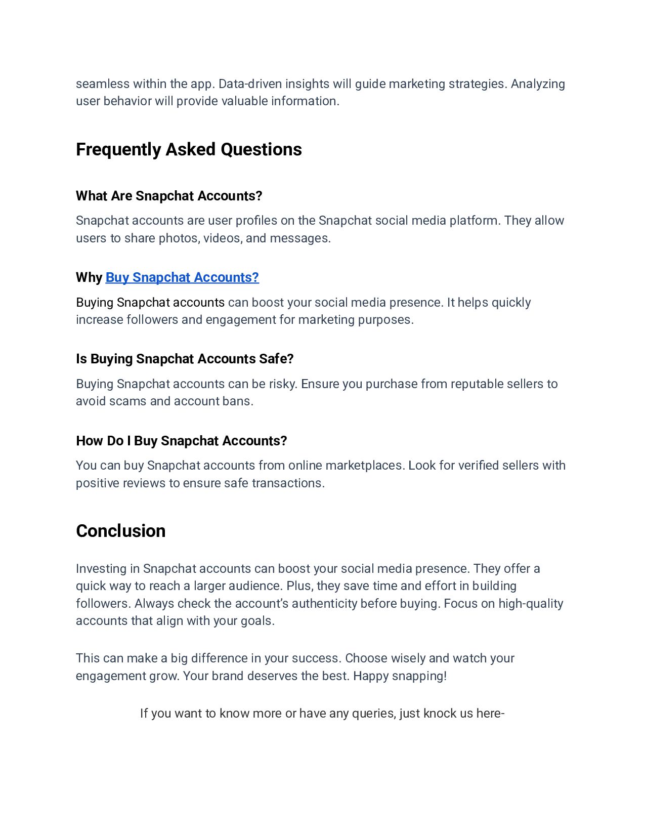 Analyzing user behavior will provide valuable information. Frequently Asked Questions What Are Snapchat Accounts? Snapchat accounts are user profiles on the Snapchat social media platform. They allow users to share photos, videos, and messages. Why Buy Snapchat Accounts? Buying Snapchat accounts can boost your social media presence. It helps quickly increase followers and engagement for marketing purposes. Is Buying Snapchat Accounts Safe? Buying Snapchat accounts can be risky. Ensure you purchase from reputable sellers to avoid scams and account bans. How Do I Buy Snapchat Accounts? You can buy Snapchat accounts from online marketplaces. Look for verified sellers with positive reviews to ensure safe transactions. Conclusion Investing in Snapchat accounts can boost your social media presence. They offer a quick way to reach a larger audience. Plus, they save time and effort in building followers. Always check the account’s authenticity before buying. Focus on high-quality accounts that align with your goals. This can make a big difference in your success. Choose wisely and watch your engagement grow. Your brand deserves the best. Happy snapping! If you want to know more or have any queries, just knock us here-