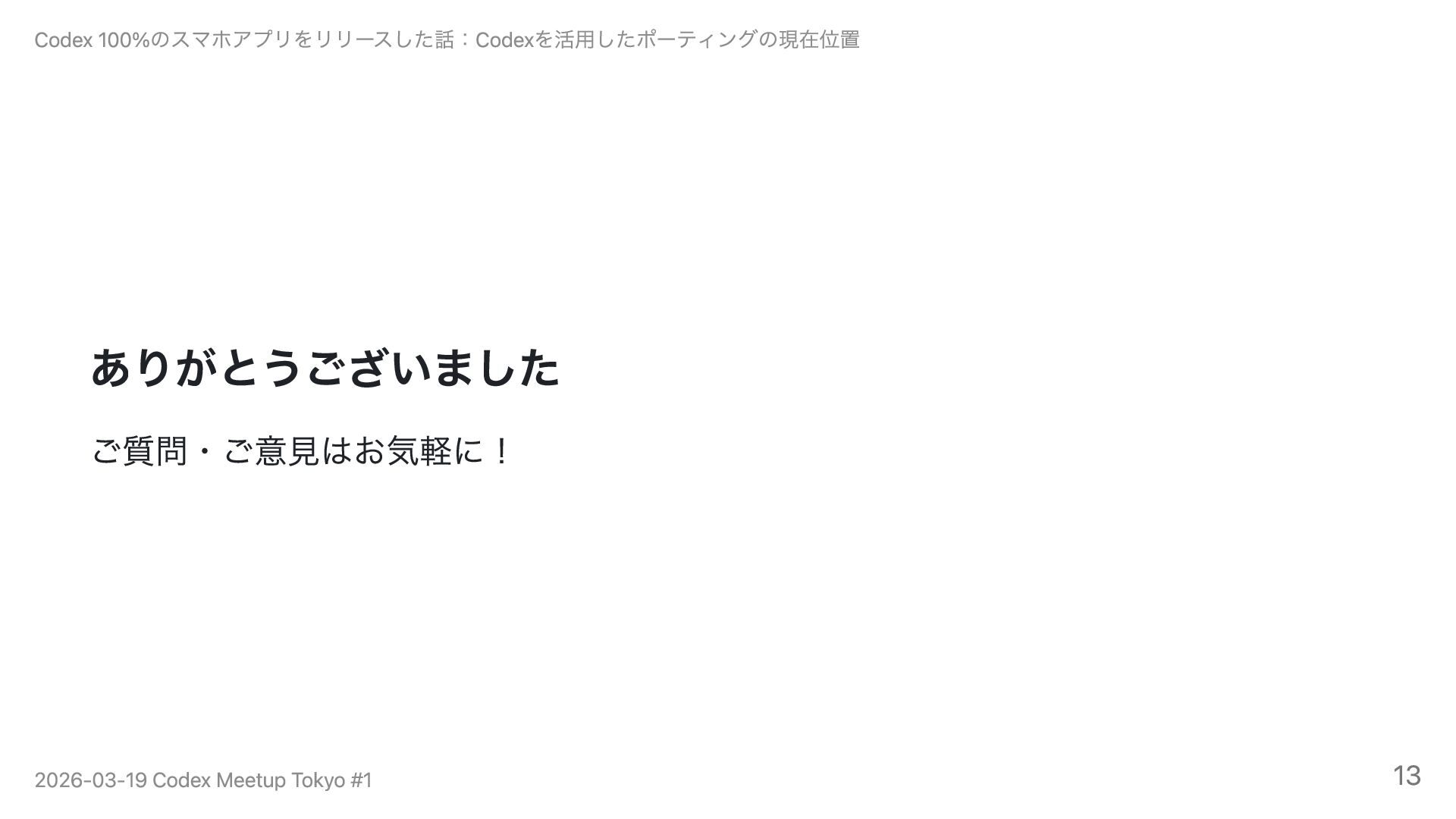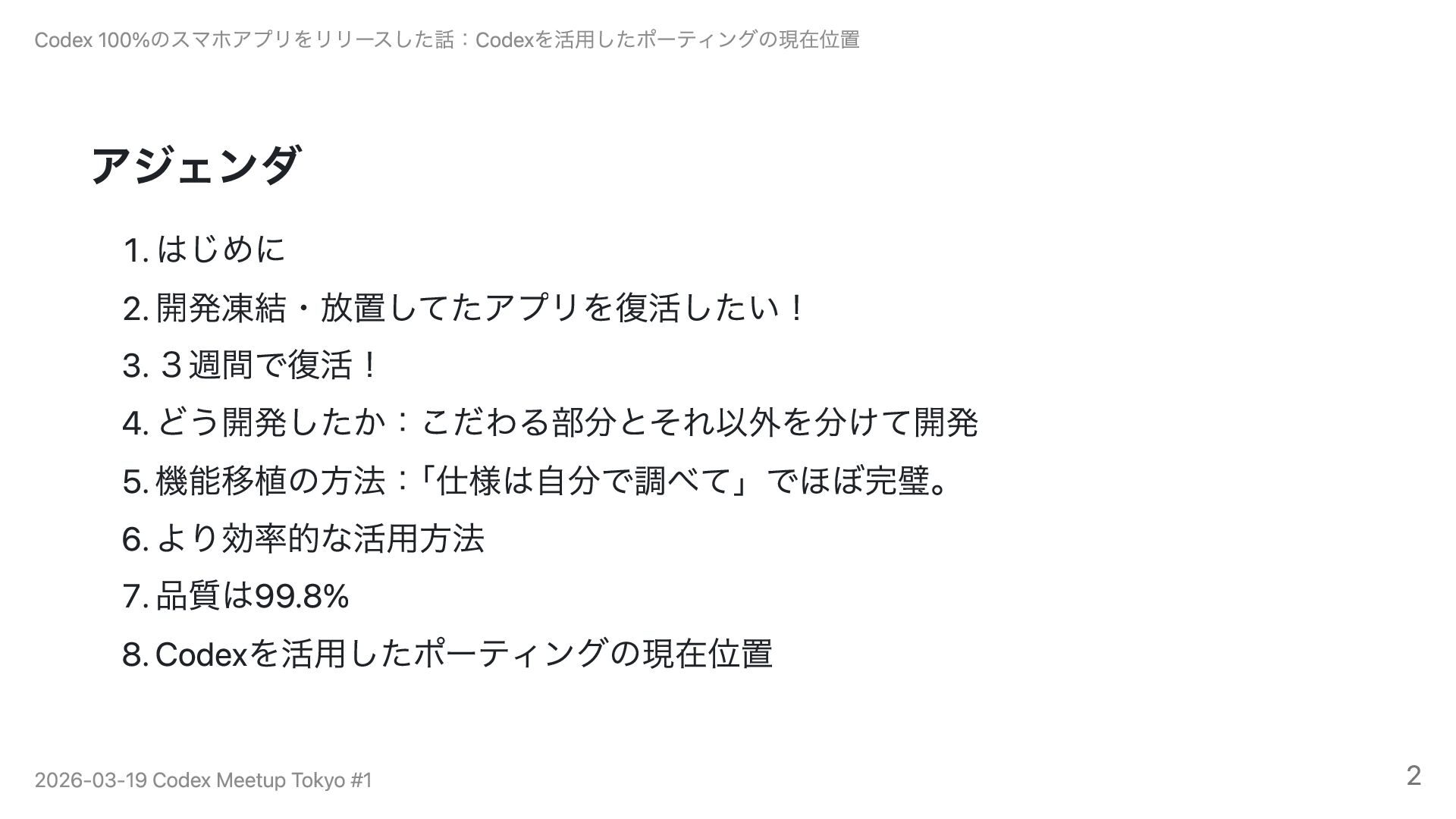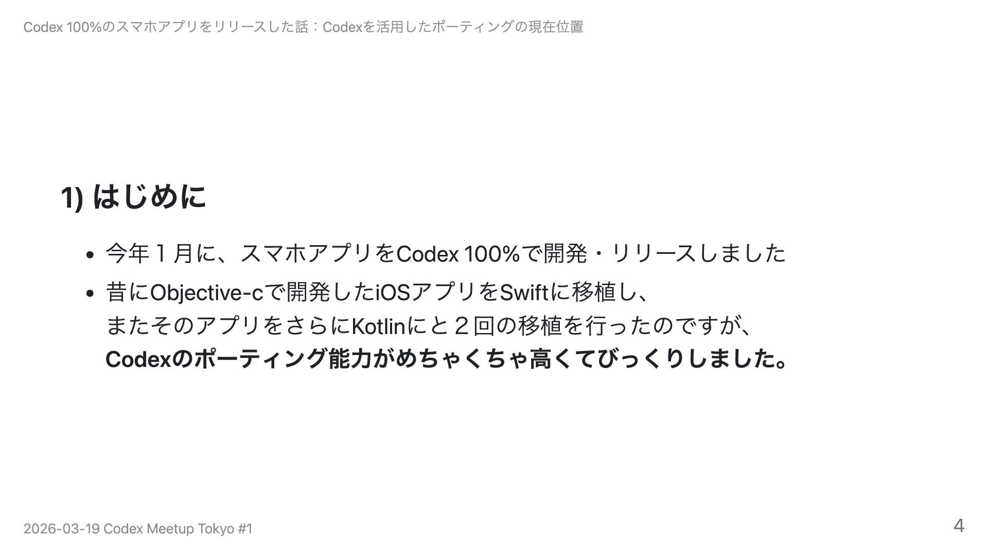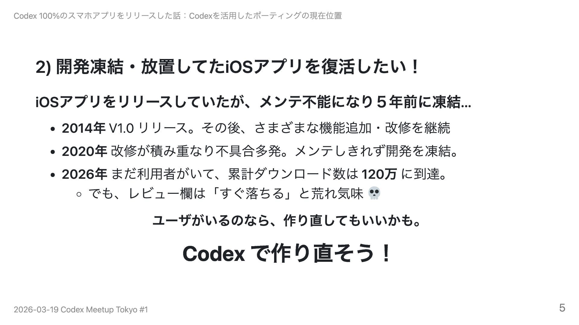 5年前に開発を凍結したObjective-C製iOSアプリ(累計120万DL)を、Codex 100%でSwift・Kotlinに移植・リリースした事例を紹介します。