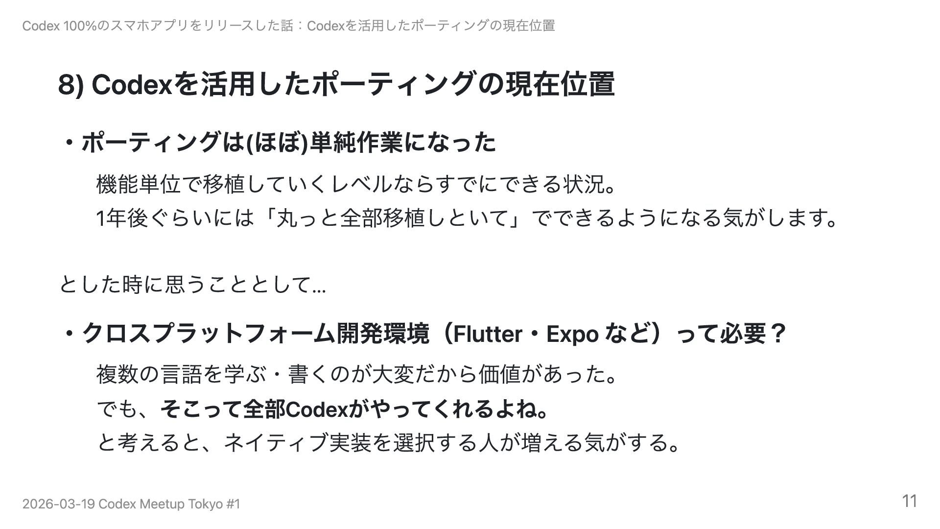 この経験から、ポーティングはすでに「苦労なくできる作業」になりつつあると感じています。FlutterやExpoなどクロスプラットフォーム環境の存在意義も、Codexが複数言語を書いてくれる時代に改めて問い直す必要があるのではないでしょうか。