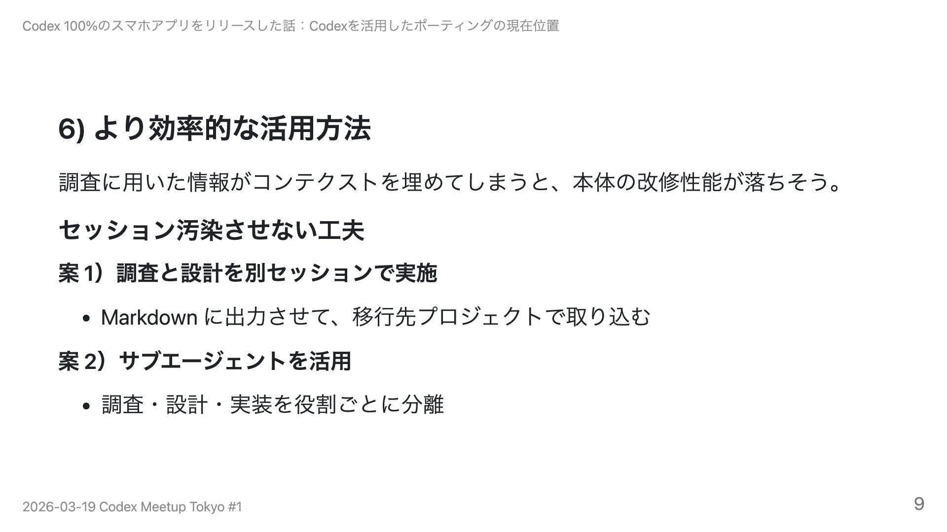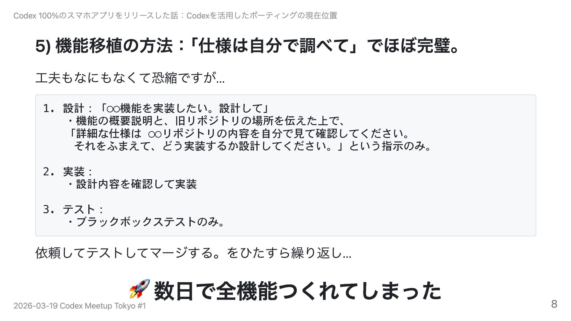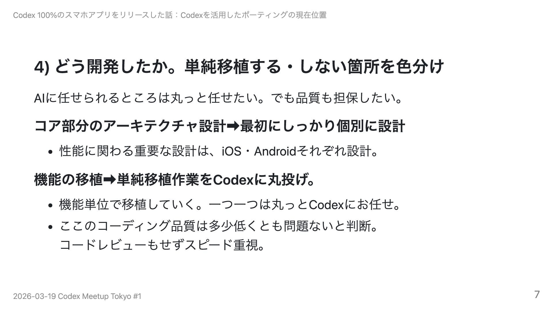 ビルドすらできない状態から、iOS版を7日・Android版を5日で開発し、3週間以内にiOS・Android両方をストア公開。開発方法のポイントは「こだわる部分とそれ以外を分ける」こと。アーキテクチャ設計は自分で行い、機能の移植はCodexに丸投げ。旧リポジトリのポインタを渡すだけで仕様を自分で読み取らせる指示スタイルで、ほぼ完璧な移植が実現できました。