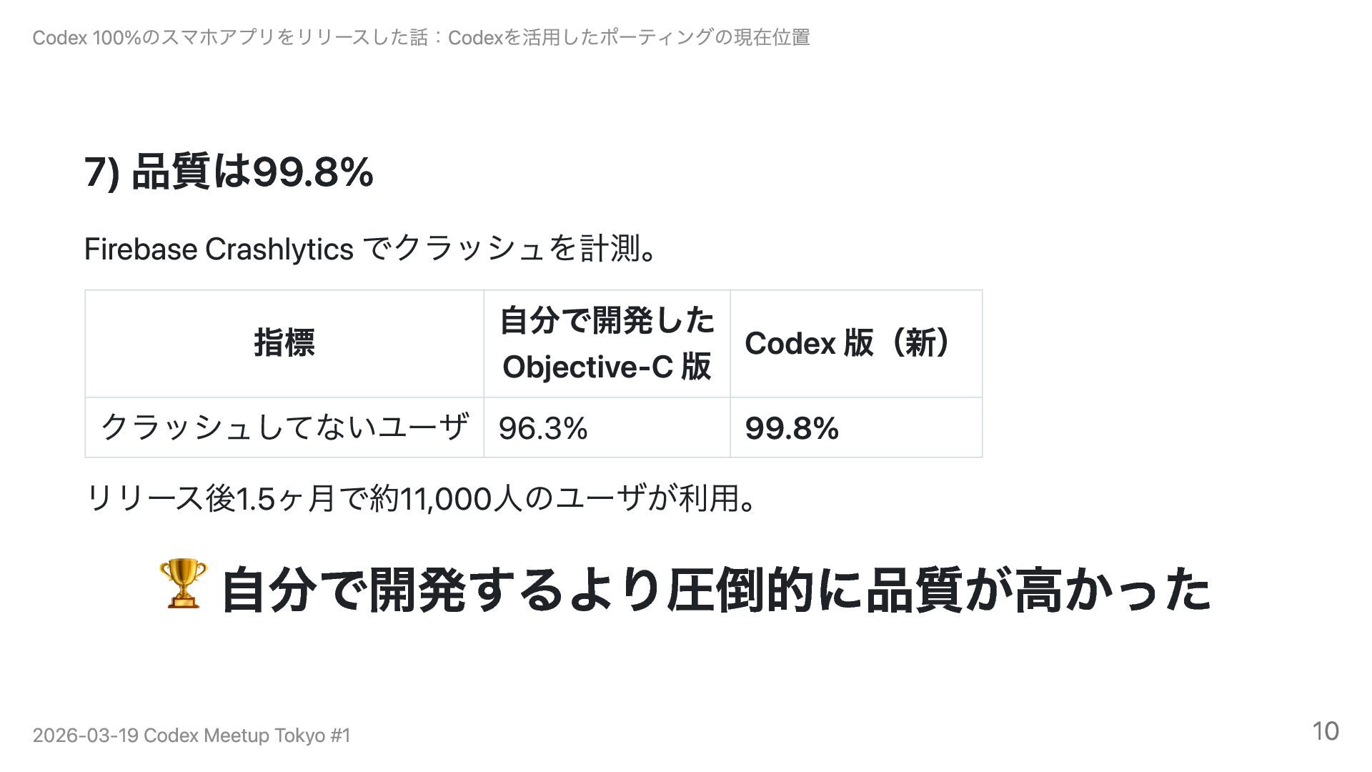 品質面でもFirebase Crashlyticsのクラッシュフリー率が旧版の96.3%から99.8%に向上。自分で書くより高品質という結果に。