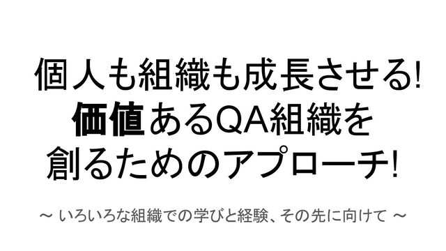 インプロセスTE • 開発組織に常駐しながら 検証の実業務と 価値提供を担う • TEコーチ • 開発組織に時々常駐して 検証の技術移転や 価値重視文化の浸透をする • TEコンサルタント/サービス • 開発組織に常駐せずに 検証の技術移転や 技術向上を担ったり、 組織横串での専門組織として 各開発組織と連携しながら 技術を向上し横展開する • TEプロモーター • 価値重視や検証技術の 方向性やビジョンを示し、 組織全体に検証を推進していく役割 (自分で手を出してはいけない) • PEのロール • スプリットPE • 開発とは別組織で 自動化・デジタル化して スピーディで効率的な業務を行う • インプロセスPE • 開発組織に常駐しながら 自動化・デジタル化の実業務と エンジニアリング文化を担う • PEコーチ • 開発組織に時々常駐して 自動化・デジタル化の技術移転や エンジニアリング文化の浸透をする • PEコンサルタント/サービス • 開発組織に常駐せずに 自動化・デジタル化の技術移転や 技術向上を担ったり、 組織横串での専門組織として 各開発組織と連携しながら 技術を向上し横展開する • PEプロモーター • エンジニアリング重視や 自動化・デジタル化技術の 方向性やビジョンを示し、 組織全体に自動化・デジタル化を推進していく 役割(自分で手を出してはいけない) • QAのロール • スプリットQA • 開発とは別組織で プロセス・メトリクスの 定義や監査を担う • インプロセスQA • 開発組織に常駐しながら QAの実業務と 組織能力向上を担う • QAコーチ • 開発組織に時々常駐して QAの技術移転や 組織能力向上文化の浸透をする • QAコンサルタント/サービス • 開発組織に常駐せずに QAの技術移転や 技術向上を担ったり、 組織横串での専門組織として 各開発組織と連携しながら 技術を向上し横展開する • QAプロモーター • 組織能力重視やQAの 方向性やビジョンを示し、 組織全体にQAを推進していく役割 (自分で手を出してはいけない) 1.0 テスター 2.0 リーダー 3.1 MGR 3.2 SQA 4.1 リーダー 4.2 MGR 5.1 リーダー 6.0 リーダー 7.0 リーダー 8.1 リーダー 9.2 MGR 9.1 MGR 9.2 MGR 5.2 リーダー 4.2 MGR 8.2 リーダー 9.2 MGR 10 リーダー 11 QA? 10 リーダー