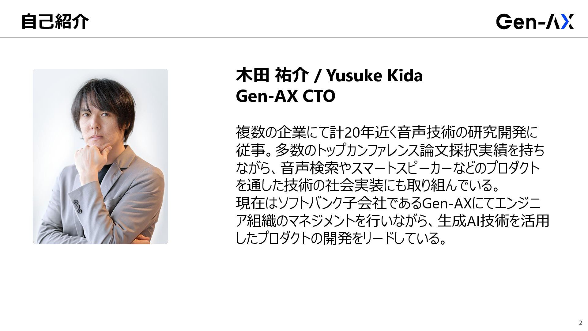 2 自己紹介 木田 祐介 / Yusuke Kida Gen-AX CTO 複数の企業にて計20年近く音声技術の研究開発に
