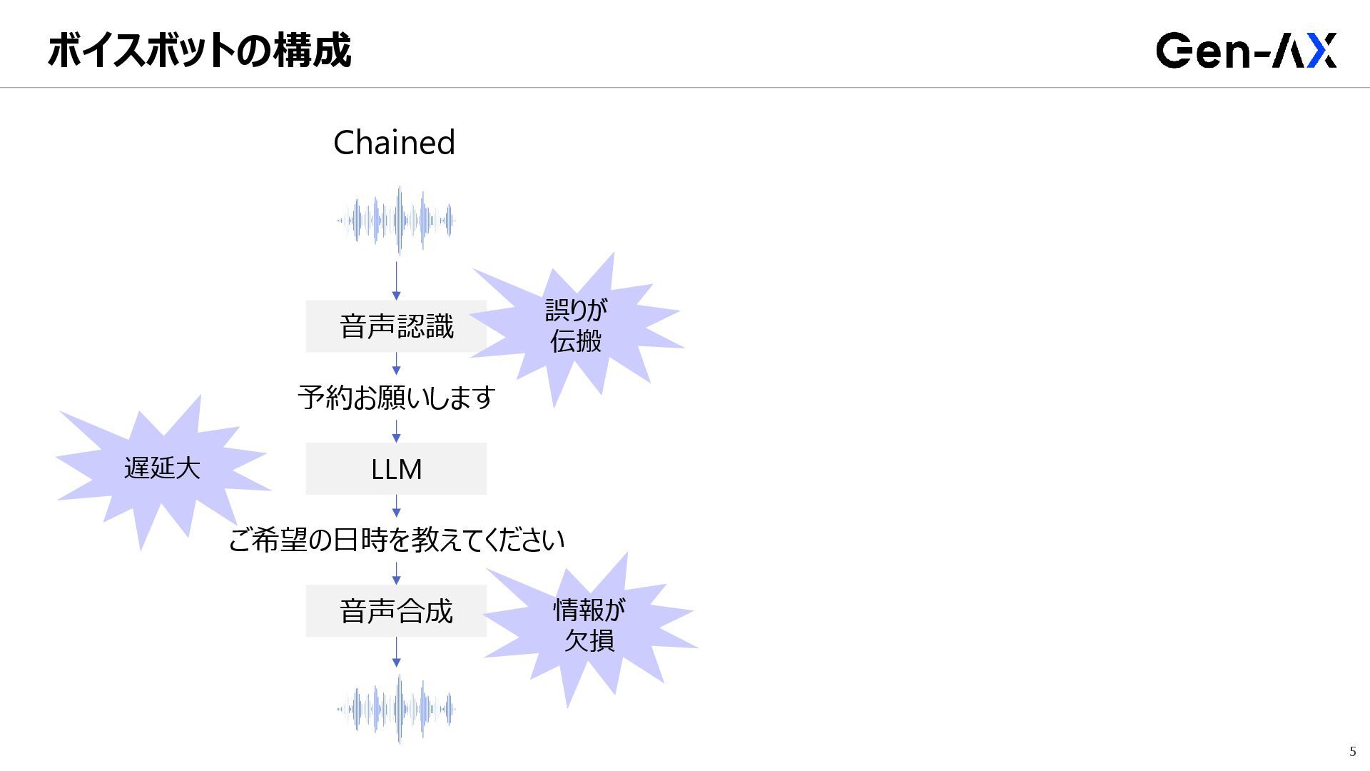 5 Chained ボイスボットの構成 音声認識 予約お願いします LLM ご希望の日時を教えてください 音声合成 遅延大 誤りが