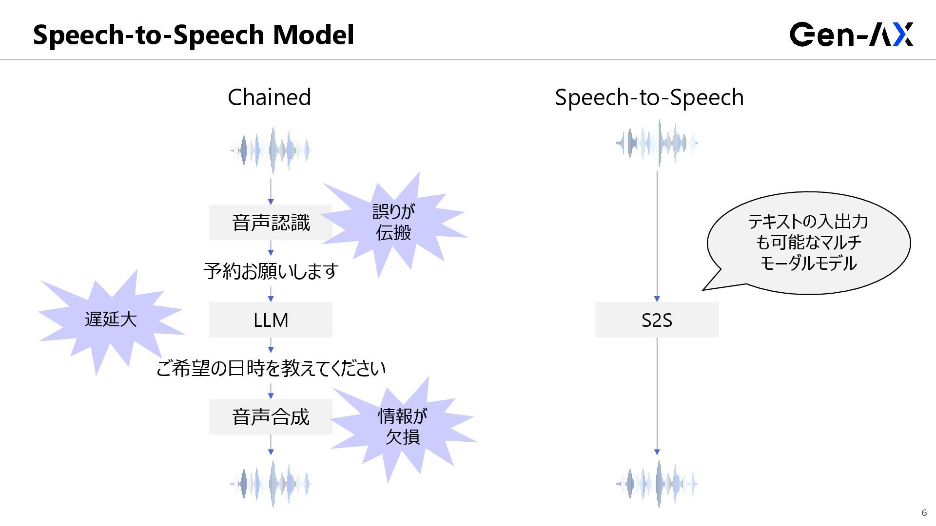 6 Speech-to-Speech Model Speech-to-Speech S2S Chained 音声認識 LLM 音声合成 誤りが
