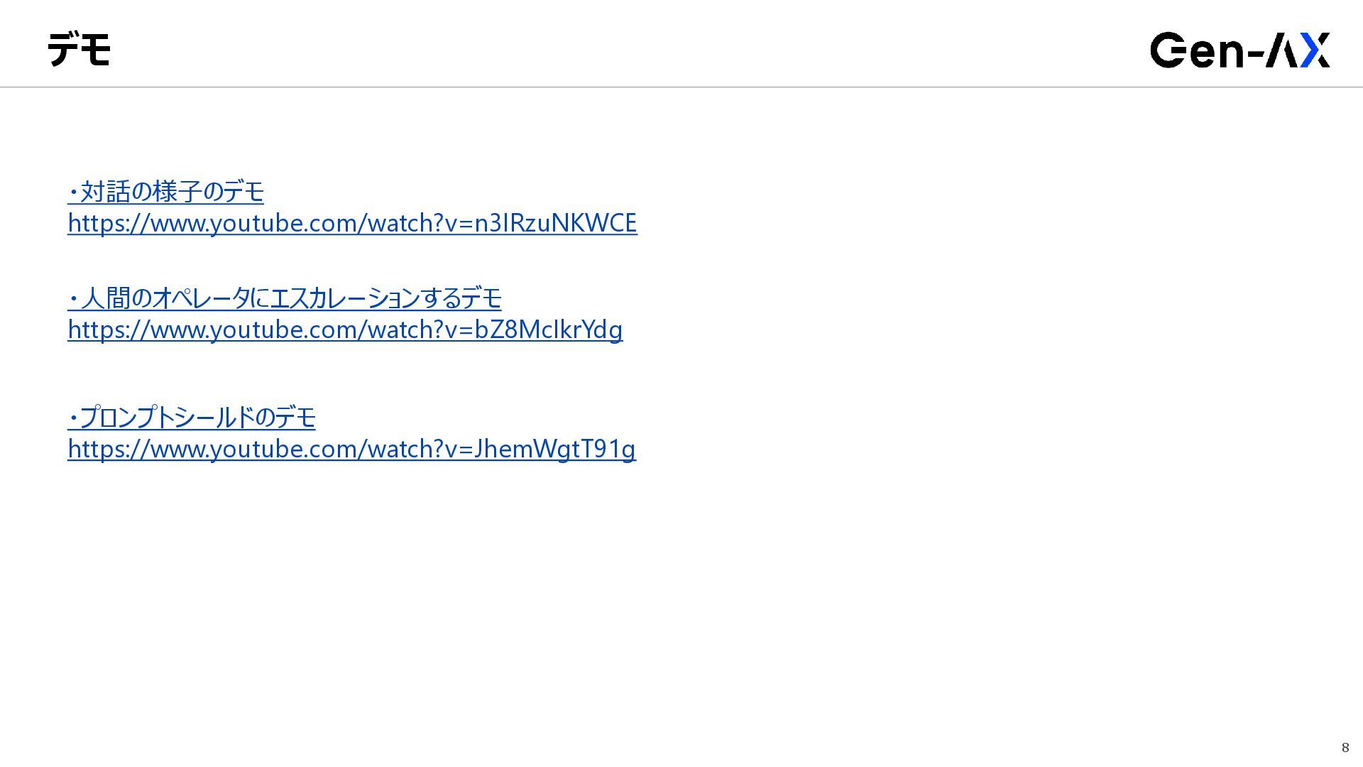 8 デモ ・対話の様子のデモ https://www.youtube.com/watch?v=n3IRzuNKWCE ・人間のオペレータにエスカレーションするデモ https://www.youtube.com/watch?v=bZ8McIkrYdg ・ プ ロ ン