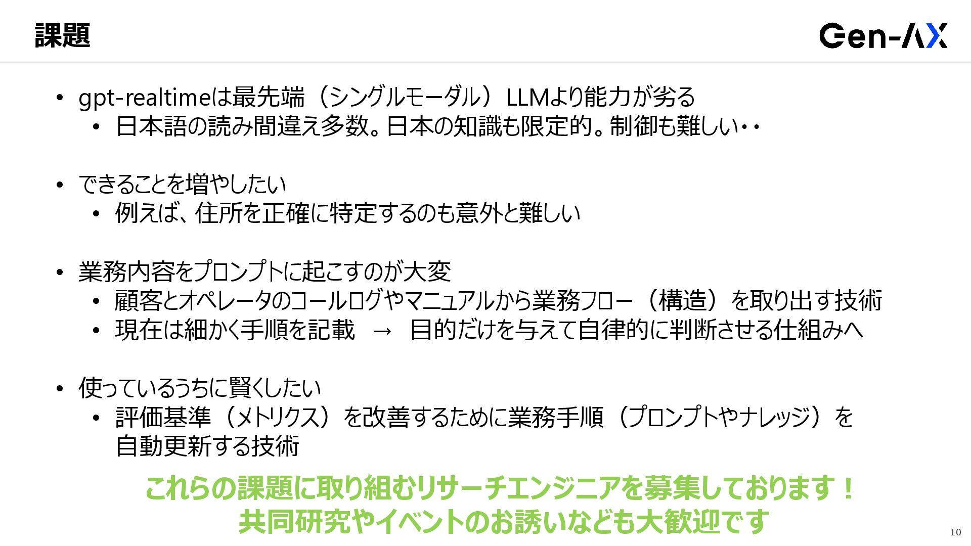 10 課題 • gpt-realtimeは最先端(シングルモーダル)LLMより能力が劣る • 日本語の読み間違え多数。日本の知識も限定的。制御も難しい・・ • できることを増やしたい • 例えば、住所を正確に特定するのも意外と難しい