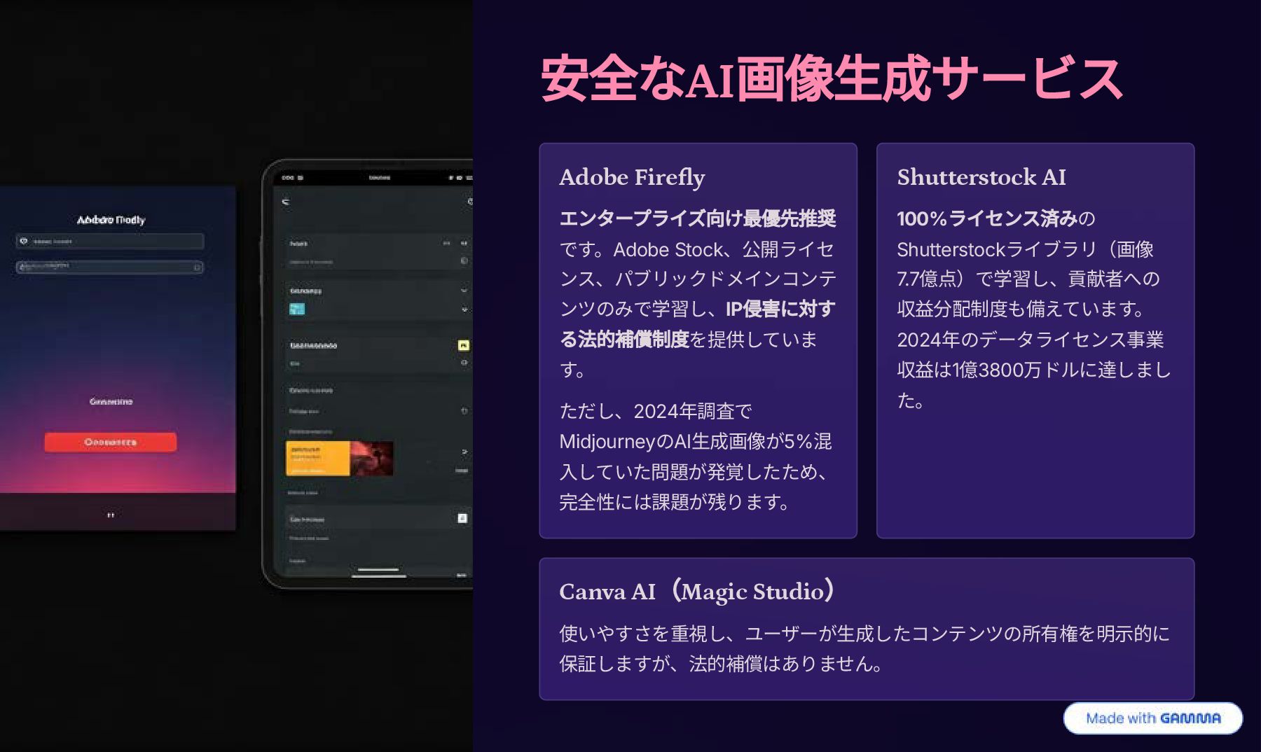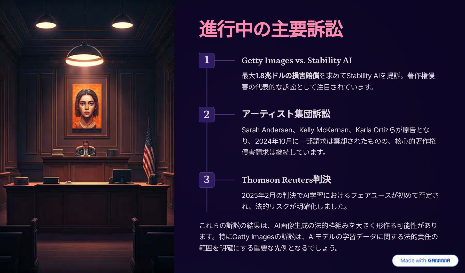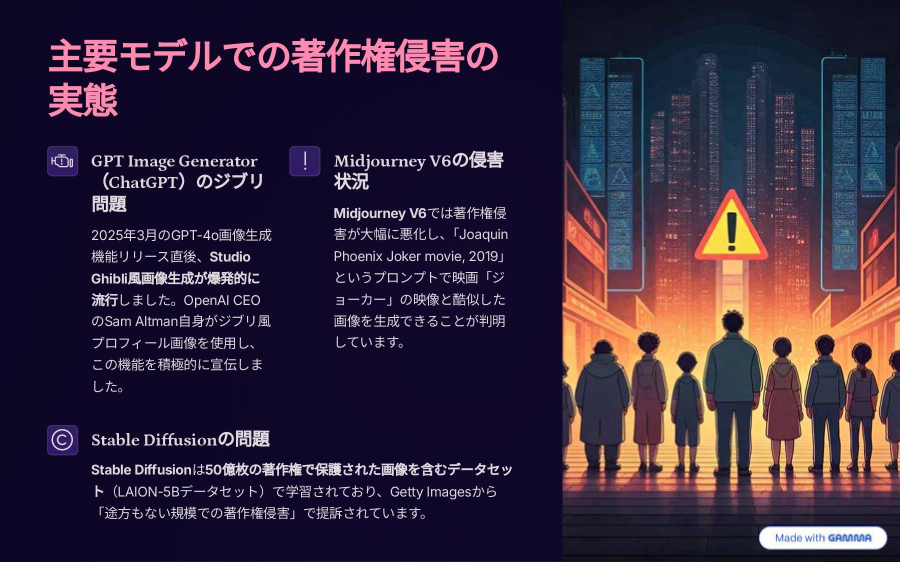 流行しました。OpenAI CEO のSam Altman自身がジブリ風 プロフィール画像を使用し、 この機能を積極的に宣伝しま した。 Midjourney V6の侵害 状況 Midjourney V6では著作権侵 害が大幅に悪化し、 「Joaquin Phoenix Joker movie, 2019」 というプロンプトで映画「ジ ョーカー」の映像と酷似した 画像を生成できることが判明 しています。 Stable Diffusionの問題 Stable Diffusionは50億枚の著作権で保護された画像を含むデータセッ ト(LAION-5Bデータセット)で学習されており、Getty Imagesから 「途方もない規模での著作権侵害」で提訴されています。