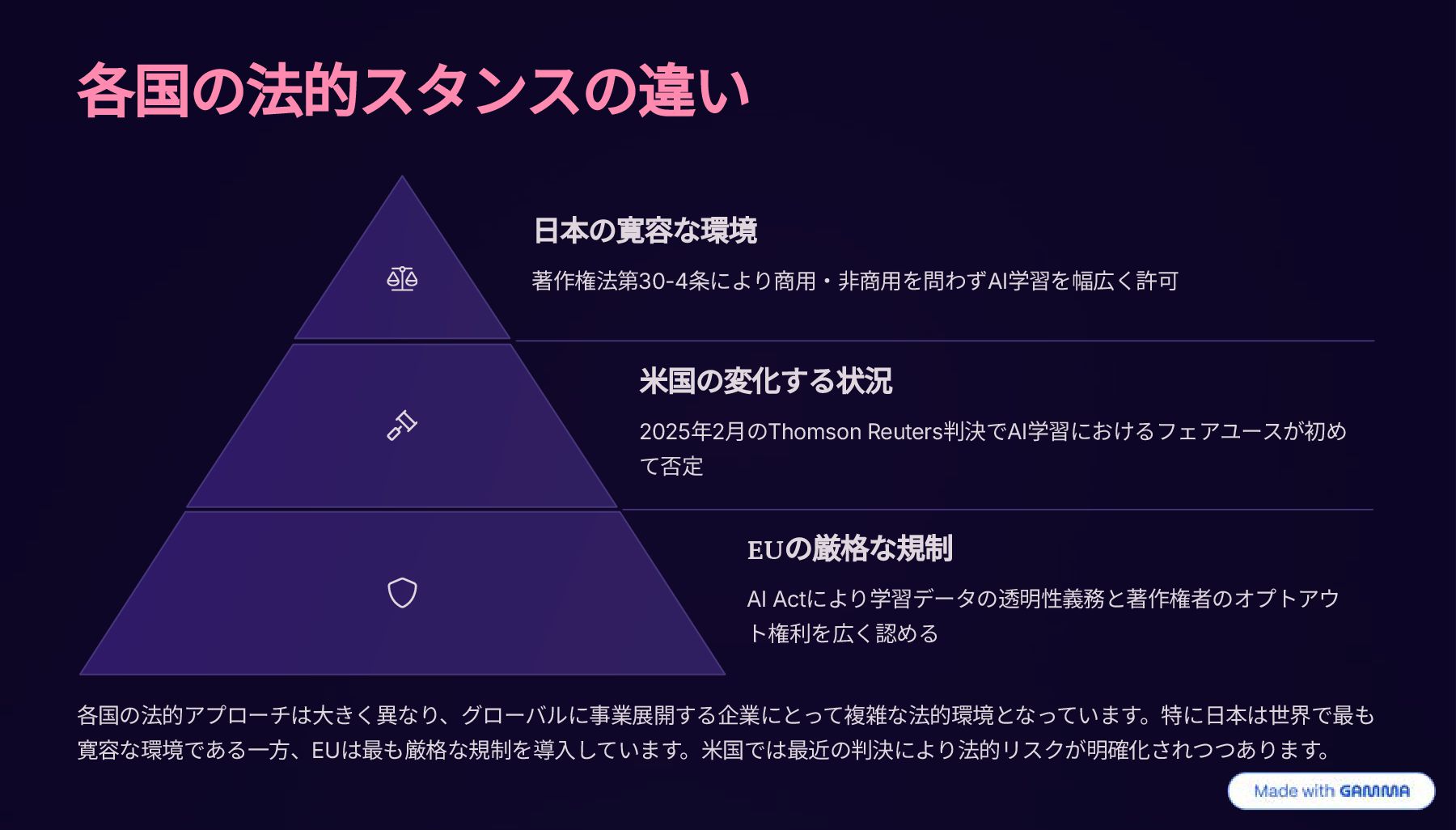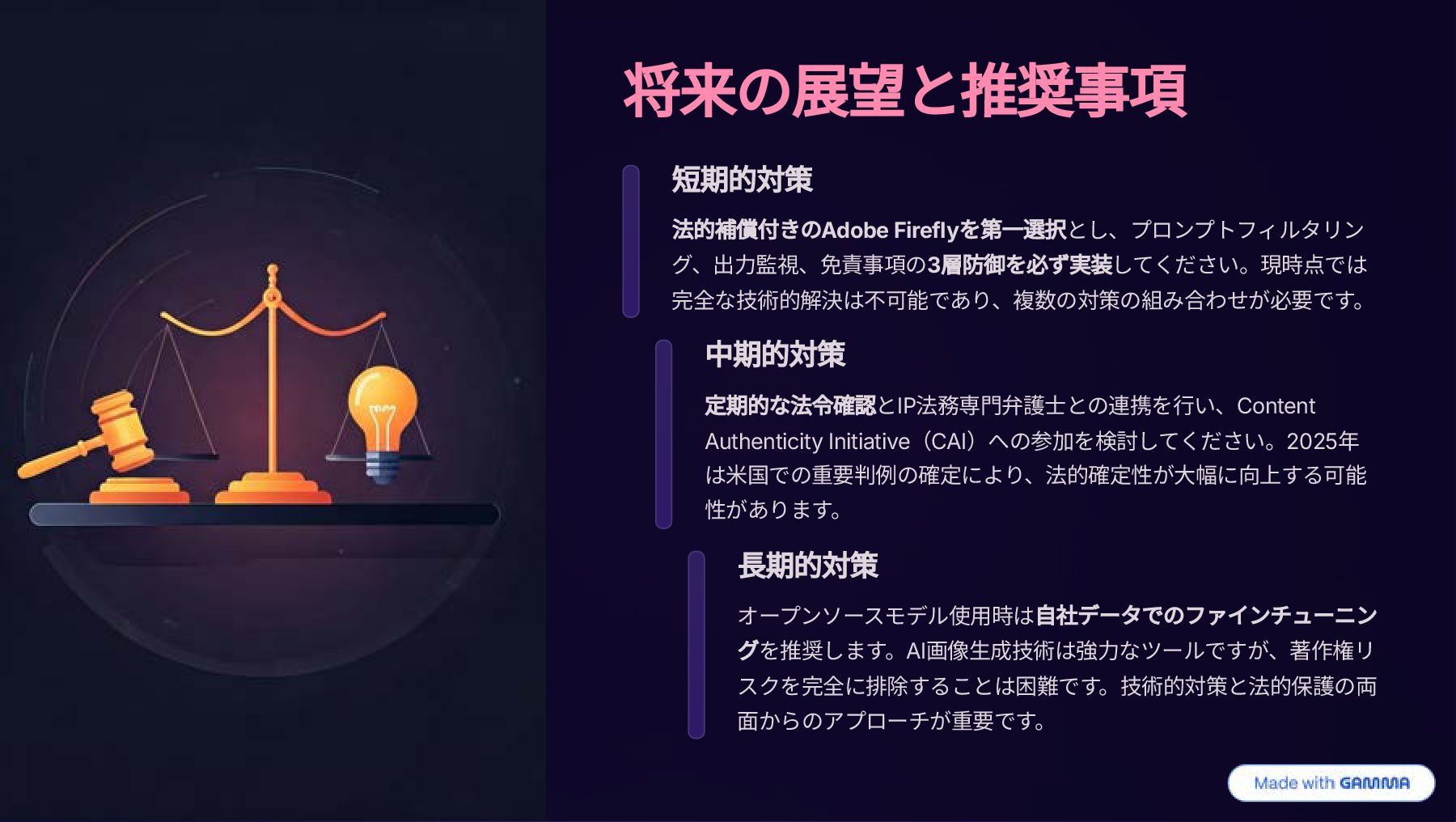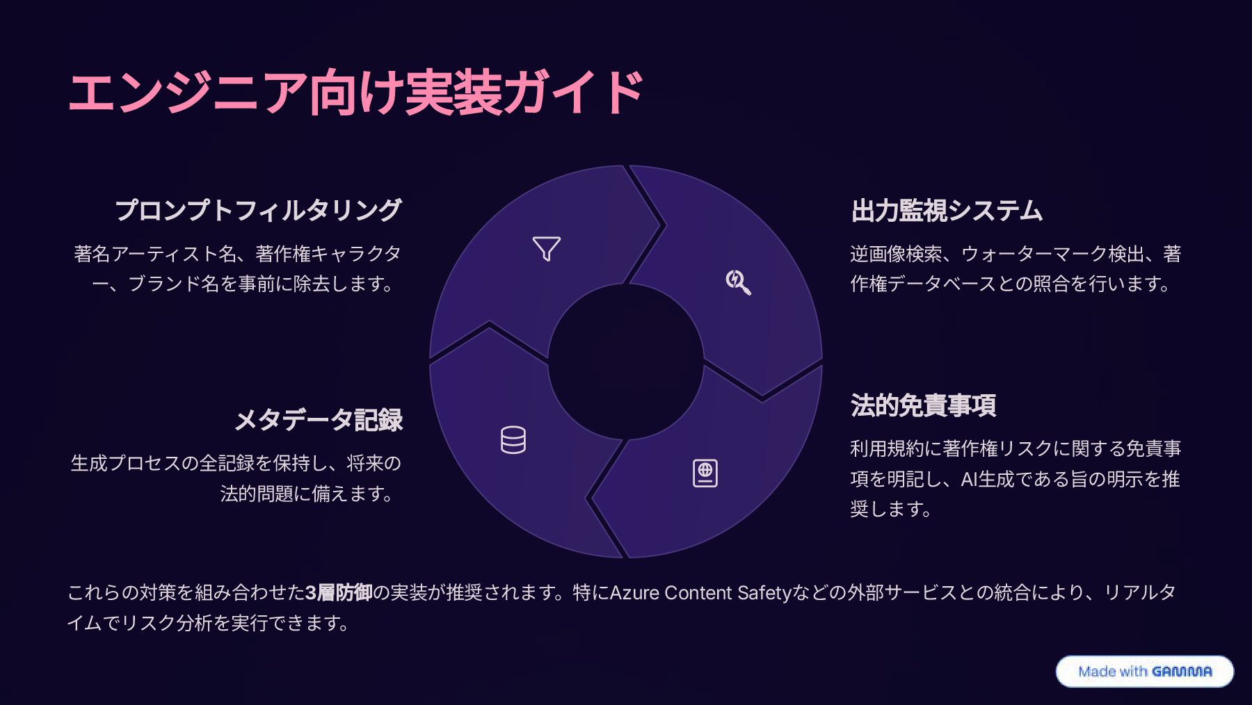 流行しました。OpenAI CEO のSam Altman自身がジブリ風 プロフィール画像を使用し、 この機能を積極的に宣伝しま した。 Midjourney V6の侵害 状況 Midjourney V6では著作権侵 害が大幅に悪化し、 「Joaquin Phoenix Joker movie, 2019」 というプロンプトで映画「ジ ョーカー」の映像と酷似した 画像を生成できることが判明 しています。 Stable Diffusionの問題 Stable Diffusionは50億枚の著作権で保護された画像を含むデータセッ ト(LAION-5Bデータセット)で学習されており、Getty Imagesから 「途方もない規模での著作権侵害」で提訴されています。