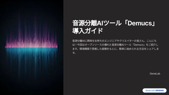 音源分離AIツール「Demucs」 導入ガイド 音源分離AIに興味をお持ちのエンジニアやクリエイターの皆さん、こんにち は!今回はオープンソースの優れた音源分離AIツール「Demucs」をご紹介し ます。環境構築で苦戦した経験をもとに、簡単に始められる方法をシェアしま す。 GeneLab