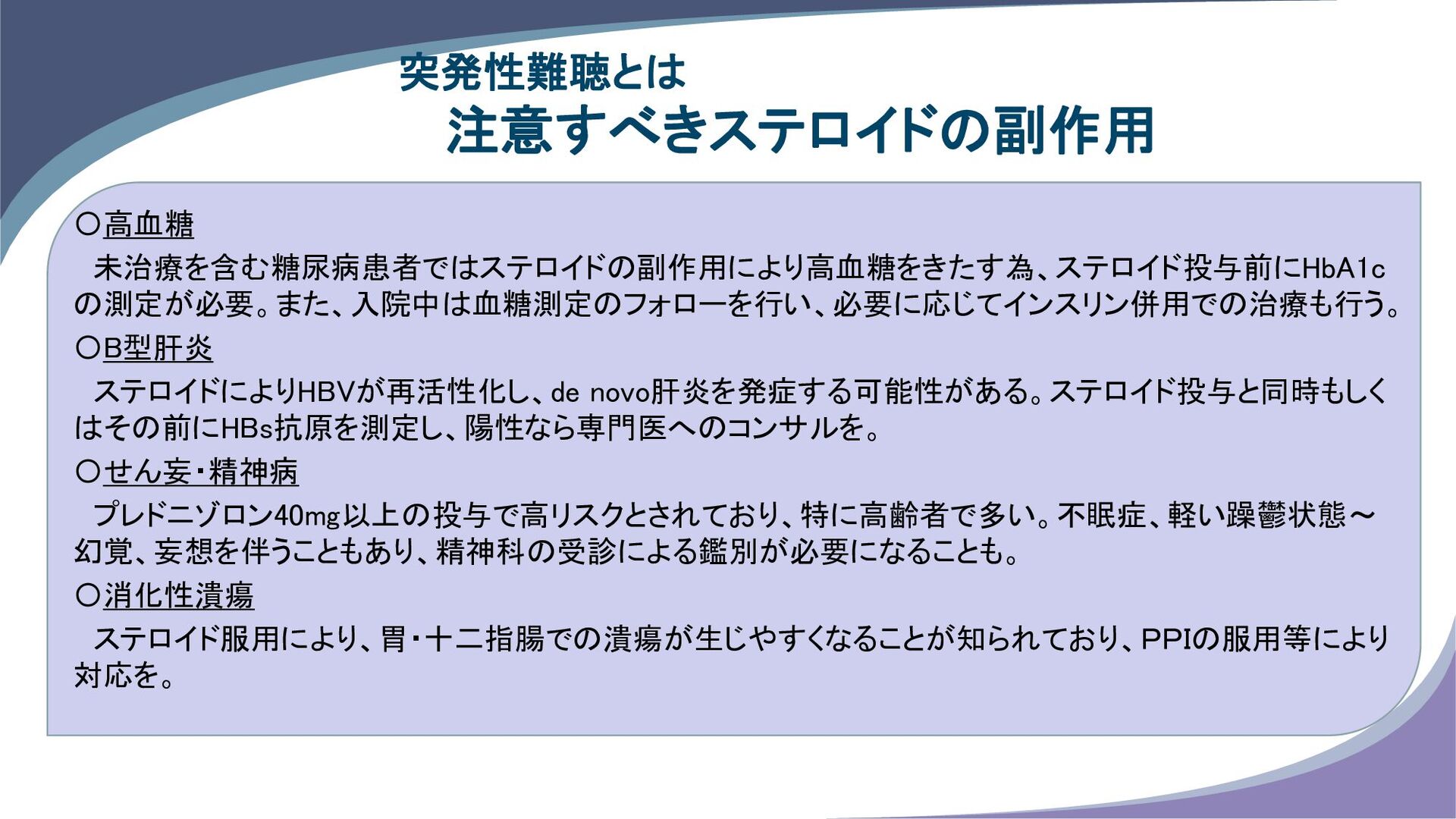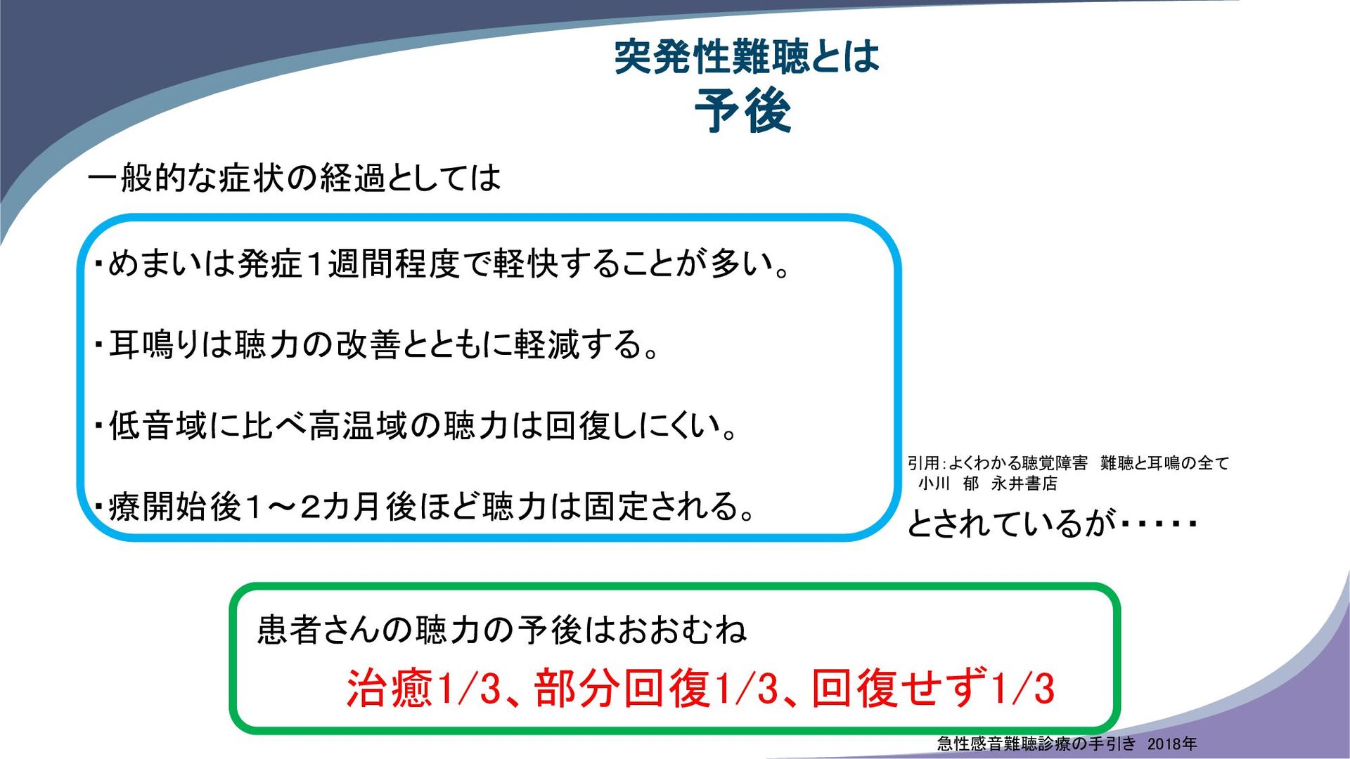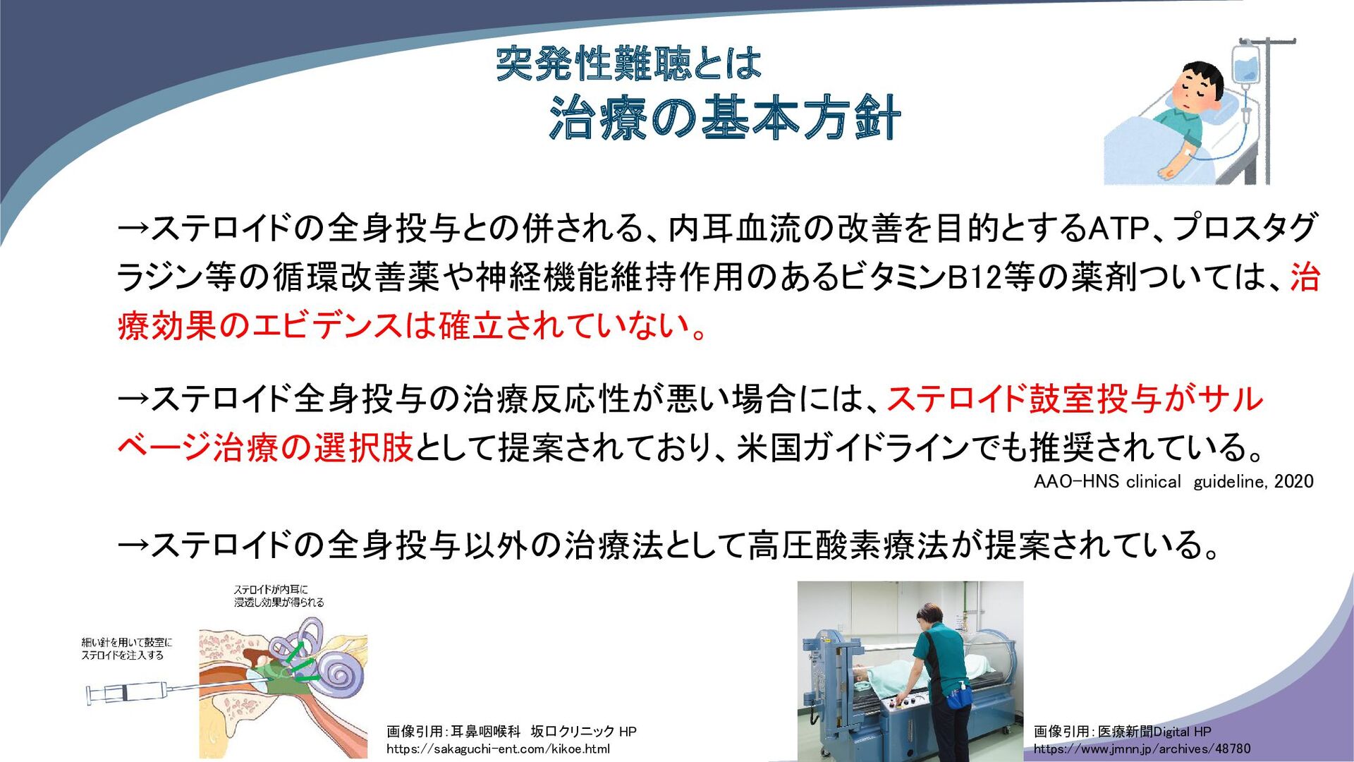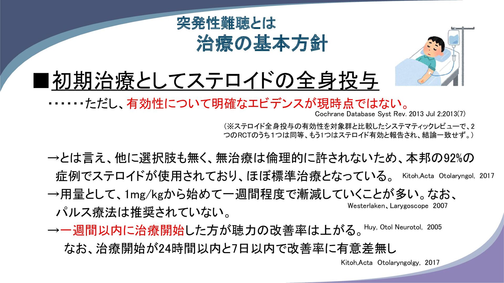 →一週間以内に治療開始した方が聴力の改善率は上がる。 なお、治療開始が24時間以内と7日以内で改善率に有意差無し Cochrane Database Syst Rev. 2013 Jul 2;2013(7) Westerlaken、Larygoscope 2007 Huy, Otol Neurotol, 2005 Kitoh,Acta Otolaryngolgy, 2017 Kitoh,Acta Otolaryngol, 2017 (※ステロイド全身投与の有効性を対象群と比較したシステマティックレビューで、2 つのRCTのうち1つは同等、もう1つはステロイド有効と報告され、結論一致せず。)