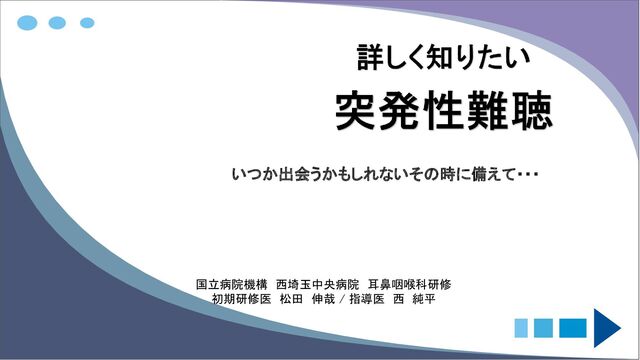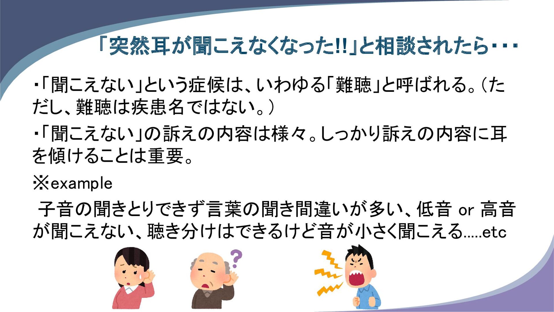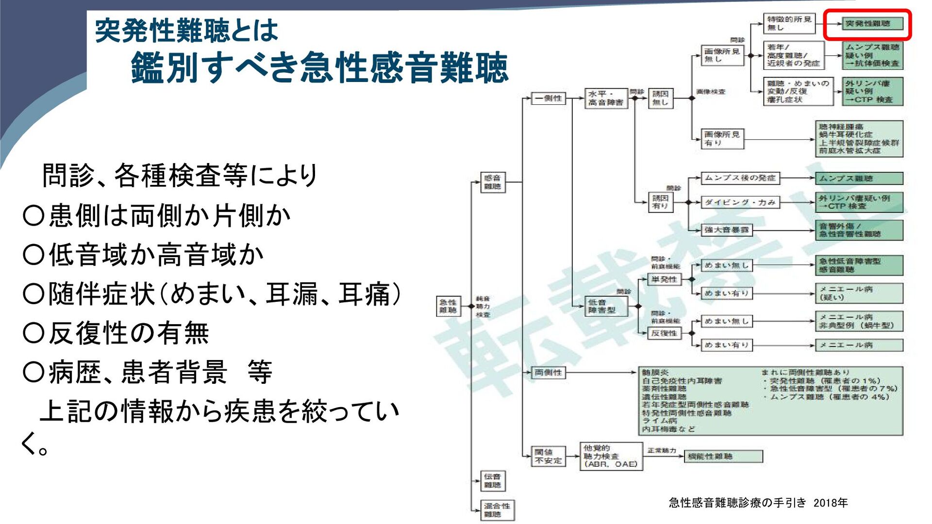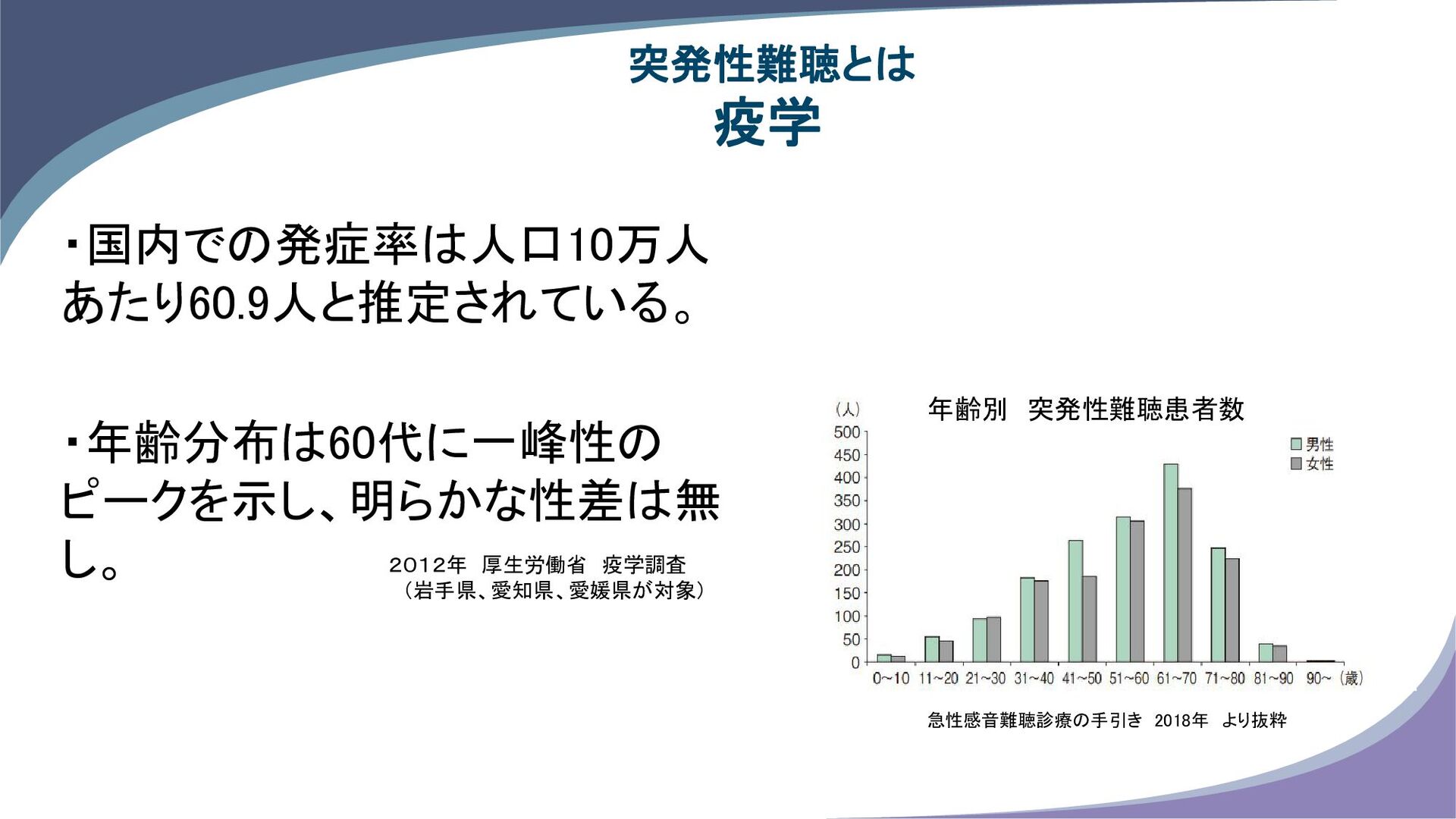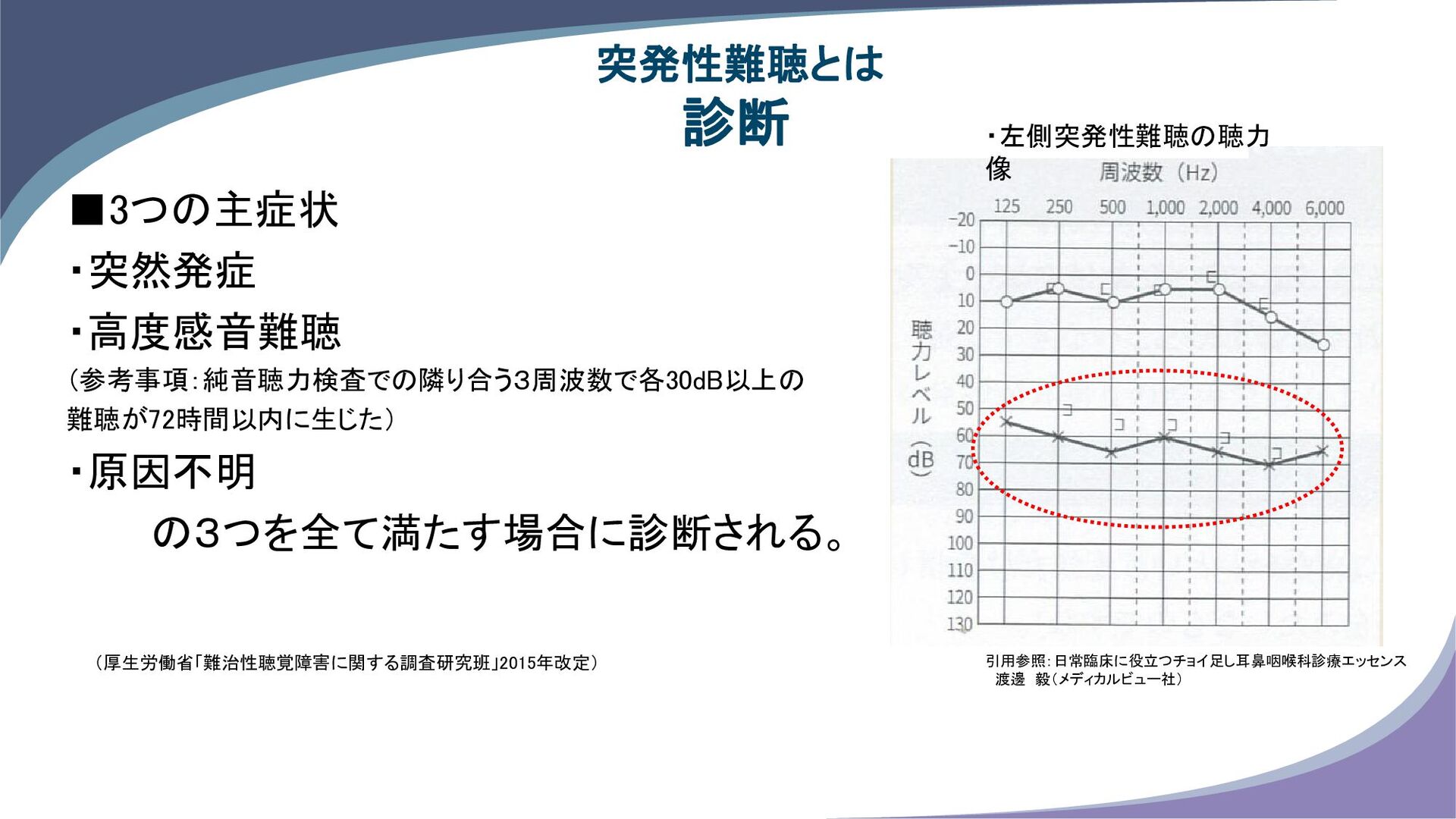 →一週間以内に治療開始した方が聴力の改善率は上がる。 なお、治療開始が24時間以内と7日以内で改善率に有意差無し Cochrane Database Syst Rev. 2013 Jul 2;2013(7) Westerlaken、Larygoscope 2007 Huy, Otol Neurotol, 2005 Kitoh,Acta Otolaryngolgy, 2017 Kitoh,Acta Otolaryngol, 2017 (※ステロイド全身投与の有効性を対象群と比較したシステマティックレビューで、2 つのRCTのうち1つは同等、もう1つはステロイド有効と報告され、結論一致せず。)