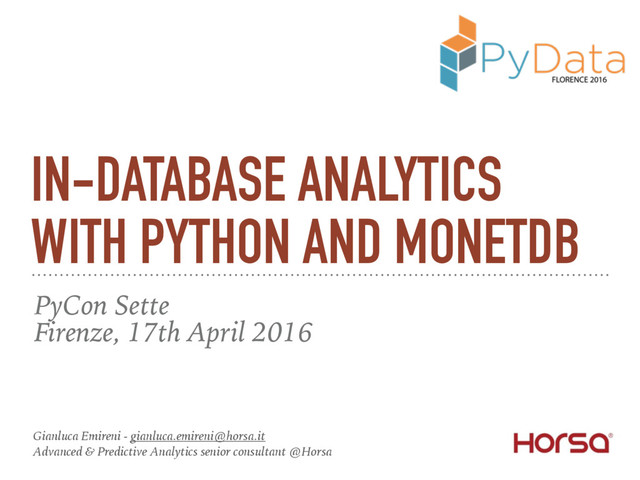 sockets, making high dimensional databases analysis inefficients. ➤ The embedded Python/NumPy in MonetDB solution has been introduced to directly incorporate Python UDFs as they were plain SQL. ➤ efficient: user NumPy arrays, that are basically Python wrappers of C arrays ➤ fast: data transfer from MonetDB to Python does not require data copy ➤ parallel execution: supports parallel execution of mappable Python functions, directly from SQL queries ➤ flexible: all the Python modules can be used.