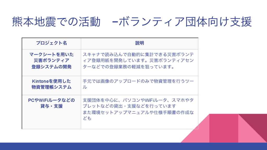 Ҋ͍ͯ͠·͢ ࣏ࣗମHPϨεΩϡʔ ϓϩδΣΫτ ࣏ࣗମϗʔϜϖʔδϨεΩϡʔϓϩδΣΫτ ඃࡂऀٴͼࢧԉʹඞཁͳ࣏ࣗମϗʔϜϖʔδ͔Βͷใൃ৴Λό οΫΞοϓ͢ΔͨΊͷϓϩδΣΫτ ɾ͘͞ΒΠϯλʔωοτ͔Βαʔόʔఏڙ Excel Geo ExcelGeo ΤΫηϧϑΝΠϧ(.xlsx, .xls)ʹ͋Δॅॴ͔ΒҰׅͰҢܦΛऔ ಘ͢ΔΣϒΞϓϦͷ։ൃ/ӡ༻ ɾ͘͞ΒΠϯλʔωοτ͔Βαʔόʔఏڙ ٗʹҙνϥγ ඃࡂͰͷٗඃΛࢭ͢ΔͨΊͷνϥγΛɺίϯϏχͷωο τϫʔΫϓϦϯλʔͱ࿈ಈͯ͠ɺͲ͜Ͱɺ୭Ͱར༻͢͠ ͍Α͏ʹఏڙ
