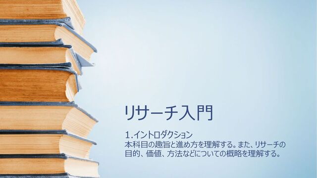 リサーチ入門 1.イントロダクション 本科目の趣旨と進め方を理解する。また、リサーチの 目的、価値、方法などについての概略を理解する。