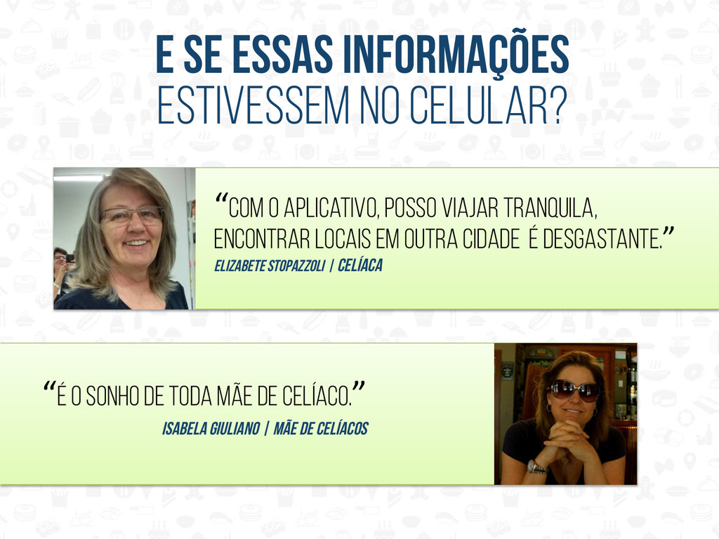 Giuliano | Mãe de Celíacos E se essas informações estivessem no Celular? “Com o aplicativo, posso viajar tranquila, encontrar locais em outra cidade é desgastante.” Elizabete Stopazzoli | Celíaca