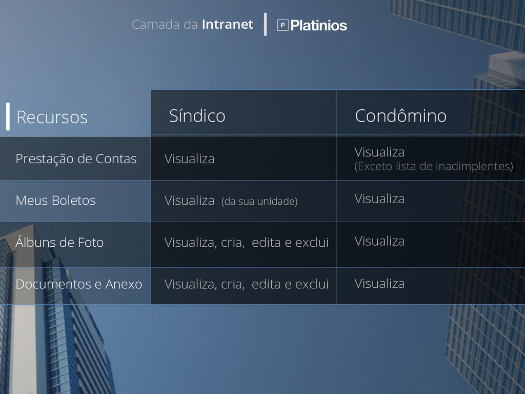 de Foto Documentos e Anexo Síndico Visualiza Visualiza (da sua unidade) Visualiza, cria, edita e exclui Visualiza, cria, edita e exclui Condômino Visualiza (Exceto lista de inadimplentes) Visualiza Visualiza Visualiza