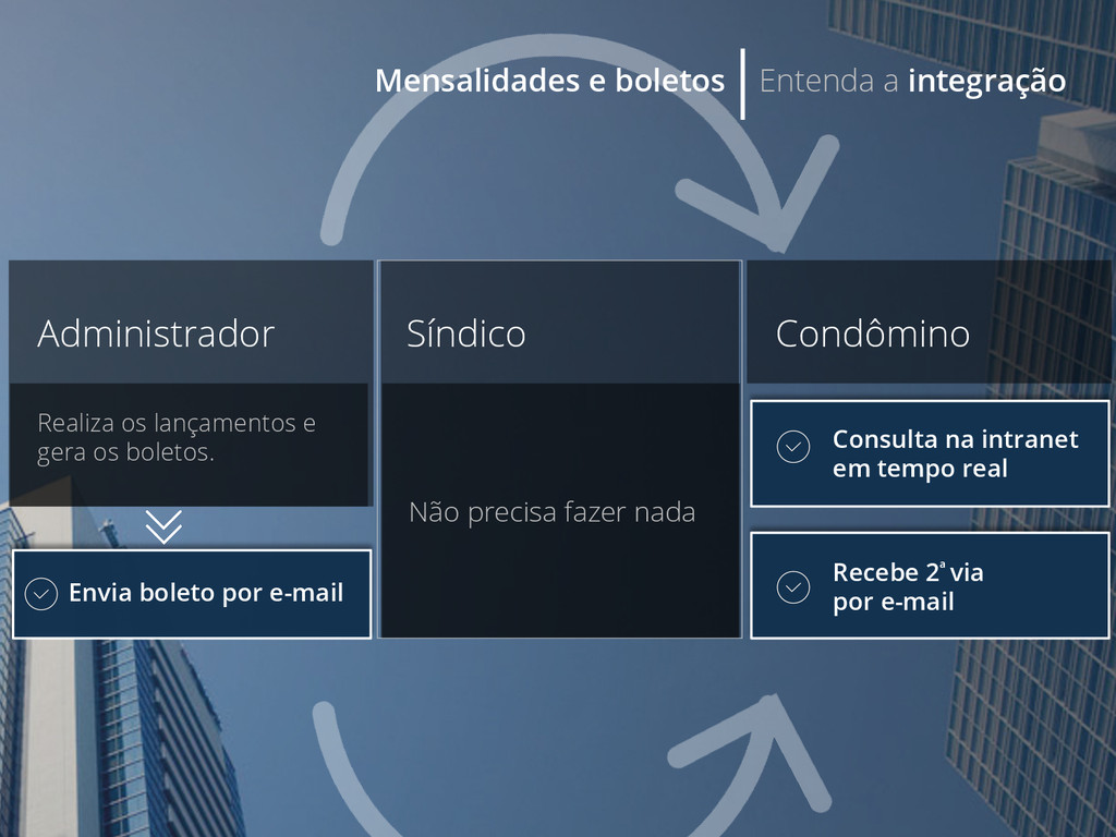 boletos. Envia boleto por e-mail Síndico Não precisa fazer nada Condômino Consulta na intranet em tempo real Recebe 2ª via por e-mail Entenda a integração