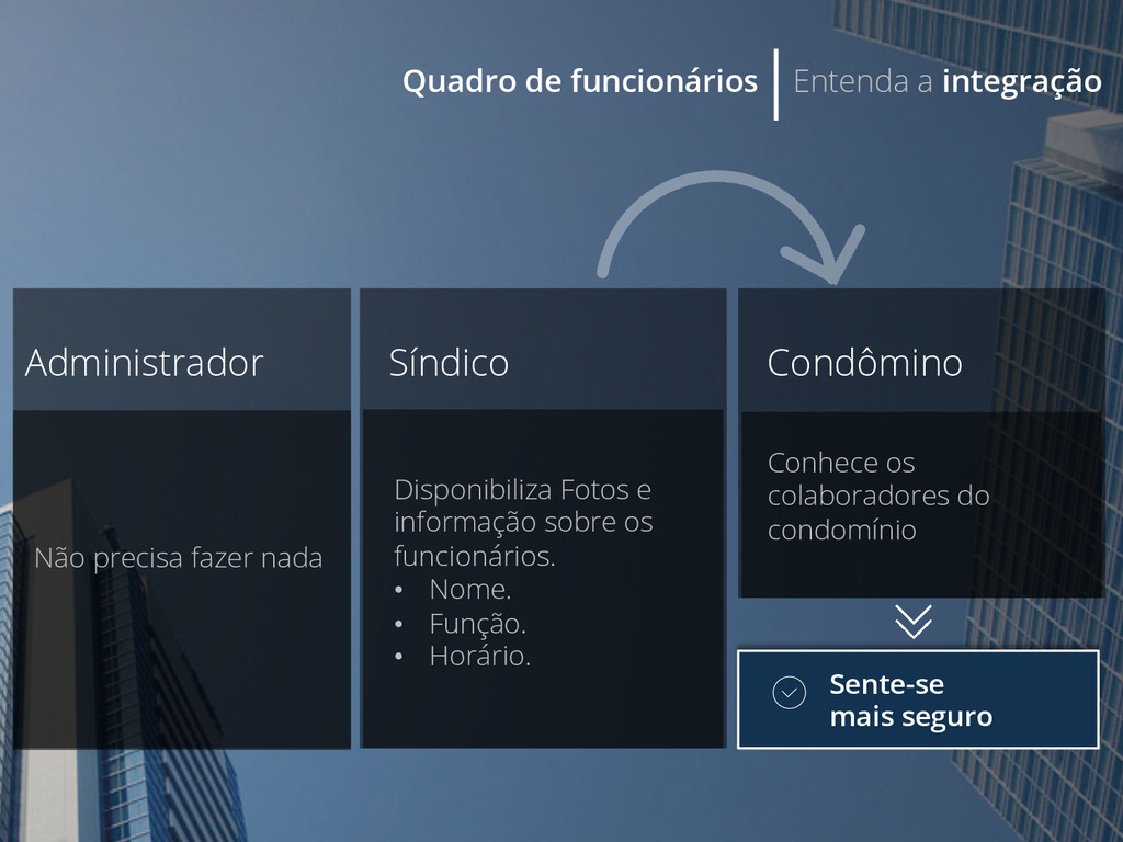 Conhece os colaboradores do condomínio Sente-se mais seguro Disponibiliza Fotos e informação sobre os funcionários. •  Nome. •  Função. •  Horário. Entenda a integração