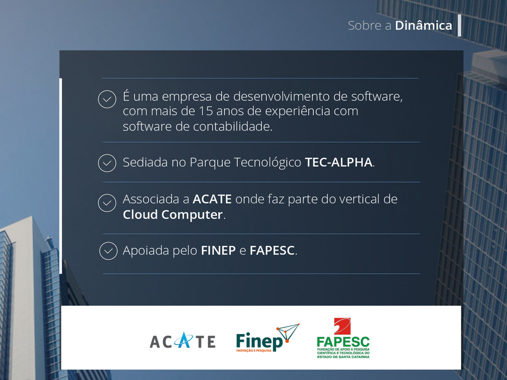 15 anos de experiência com software de contabilidade. Sediada no Parque Tecnológico TEC-ALPHA. Associada a ACATE onde faz parte do vertical de Cloud Computer. Apoiada pelo FINEP e FAPESC. Sobre a Dinâmica