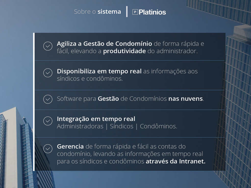 rápida e fácil, elevando a produtividade do administrador. Disponibiliza em tempo real as informações aos síndicos e condôminos. Software para Gestão de Condomínios nas nuvens. Integração em tempo real   Administradoras | Síndicos | Condôminos. Gerencia de forma rápida e fácil as contas do condomínio, levando as informações em tempo real para os síndicos e condôminos através da Intranet.