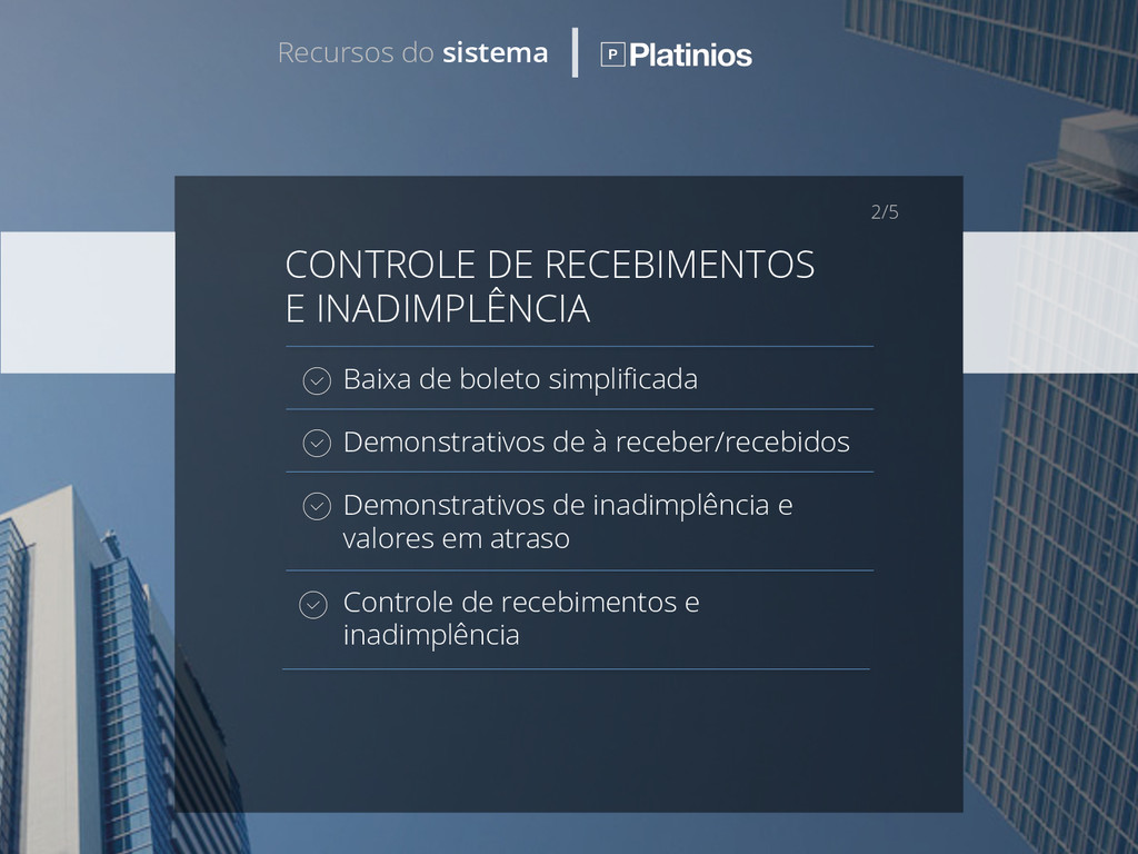 4. Recursos do sistema 2/5 CONTROLE DE RECEBIMENTOS E INADIMPLÊNCIA Baixa