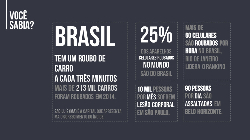 10 mil pessoas por mês sofrem lesão corporal em São Paulo. Mais de 60 celulares são roubados por hora no brasil, Rio de Janeiro lidera o ranking Brasil tem um roubo de carro a cada três minutos Mais de 213 mil carros foram roubados em 2014. São Luís (MA) é a capital que apresenta maior crescimento do índice. 25% dos aparelhos celulares roubados no mundo são do Brasil