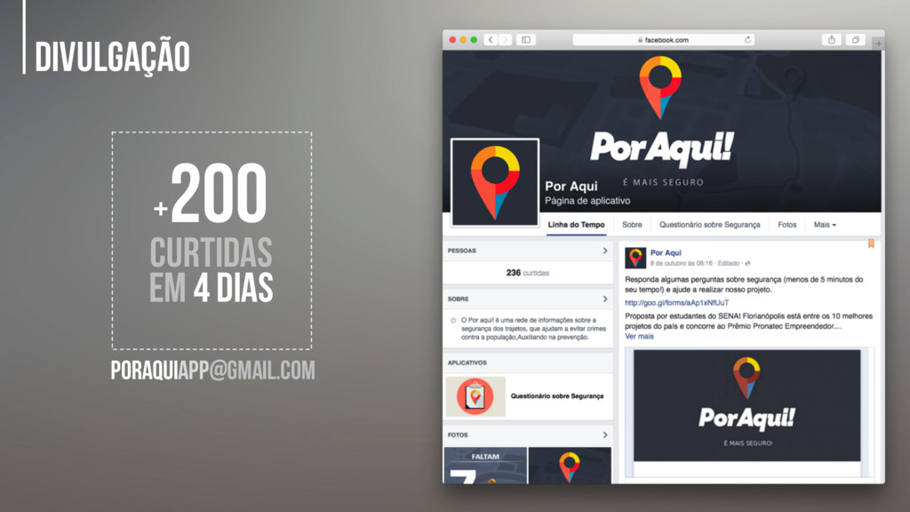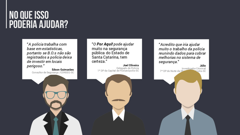 em estatísticas, portanto se B.O.s não são registrados a policia deixa de investir em locais perigoso.” Edson Guimarães Consultor de Segurança /CONSEG-SC “O Por Aqui! pode ajudar muito na segurança pública do Estado de Santa Catarina, tem certeza.” Joel Oliveira Delegado de Polícia 1ª DP da Capital de Florianópolis-SC “Acredito que iria ajudar muito o trabalho da polícia reunindo dados para cobrar melhorias no sistema de segurança.” Júlio Investigador Criminal 7ª DP do Norte da Ilha - Florianópolis-SC