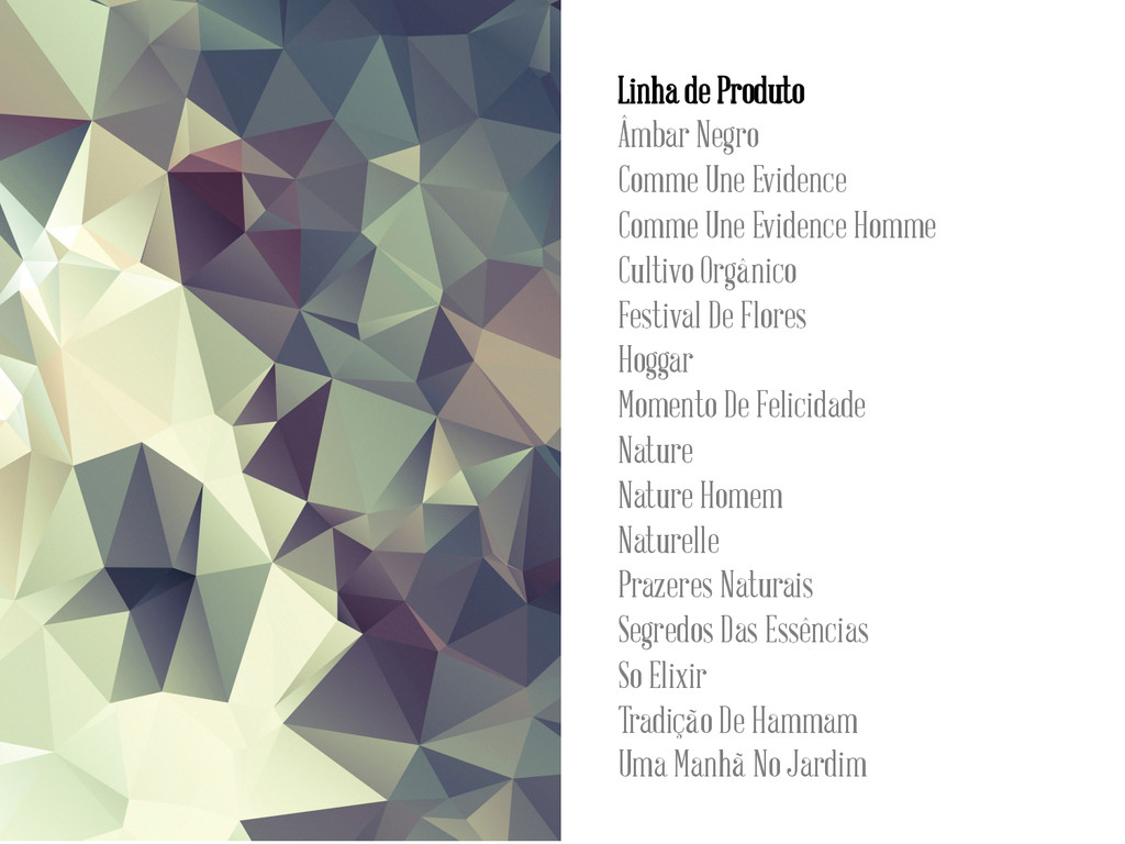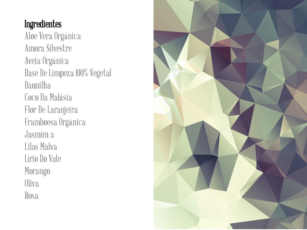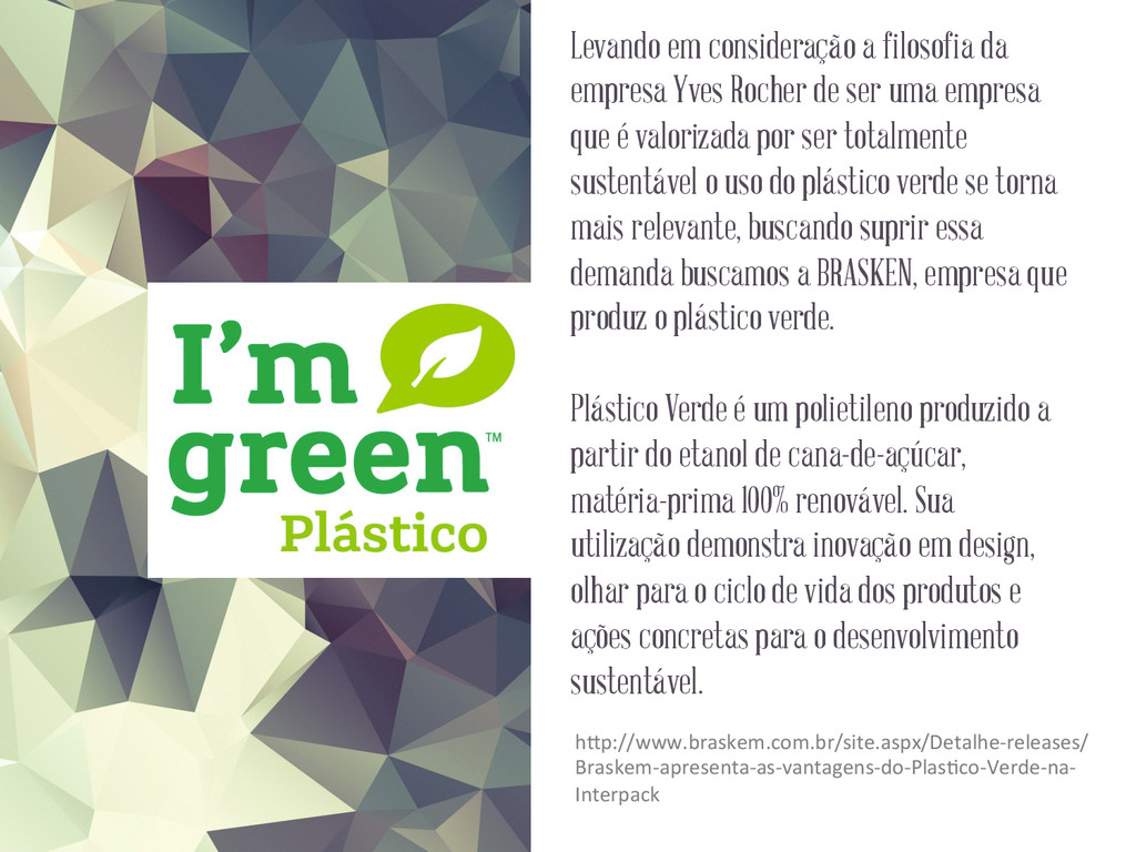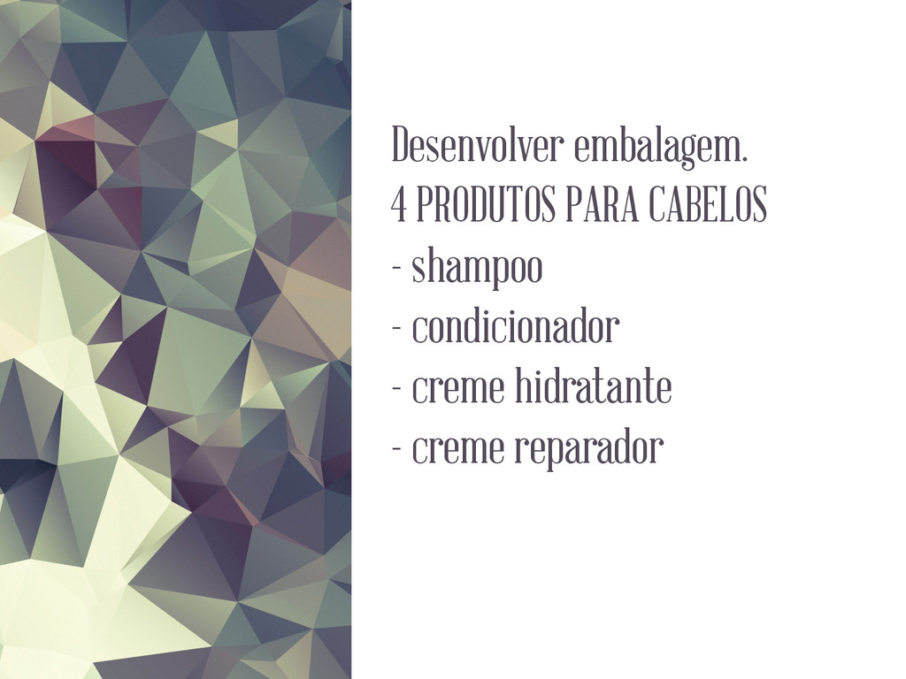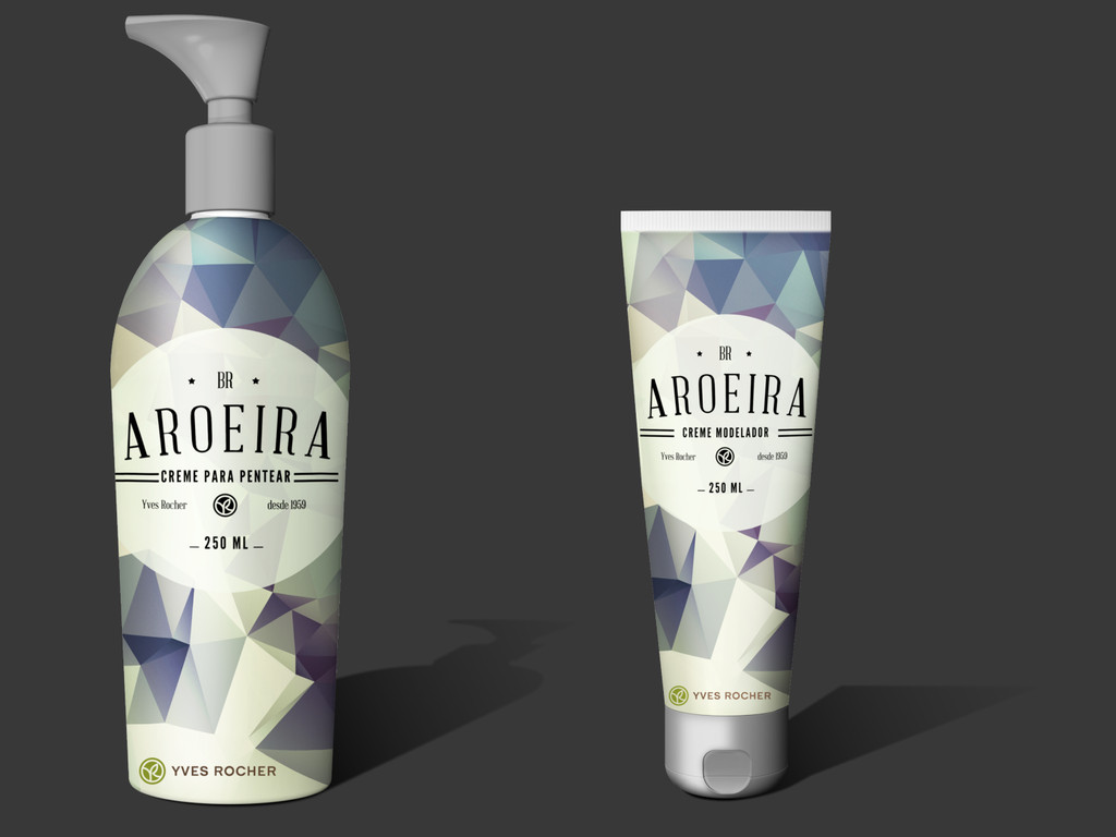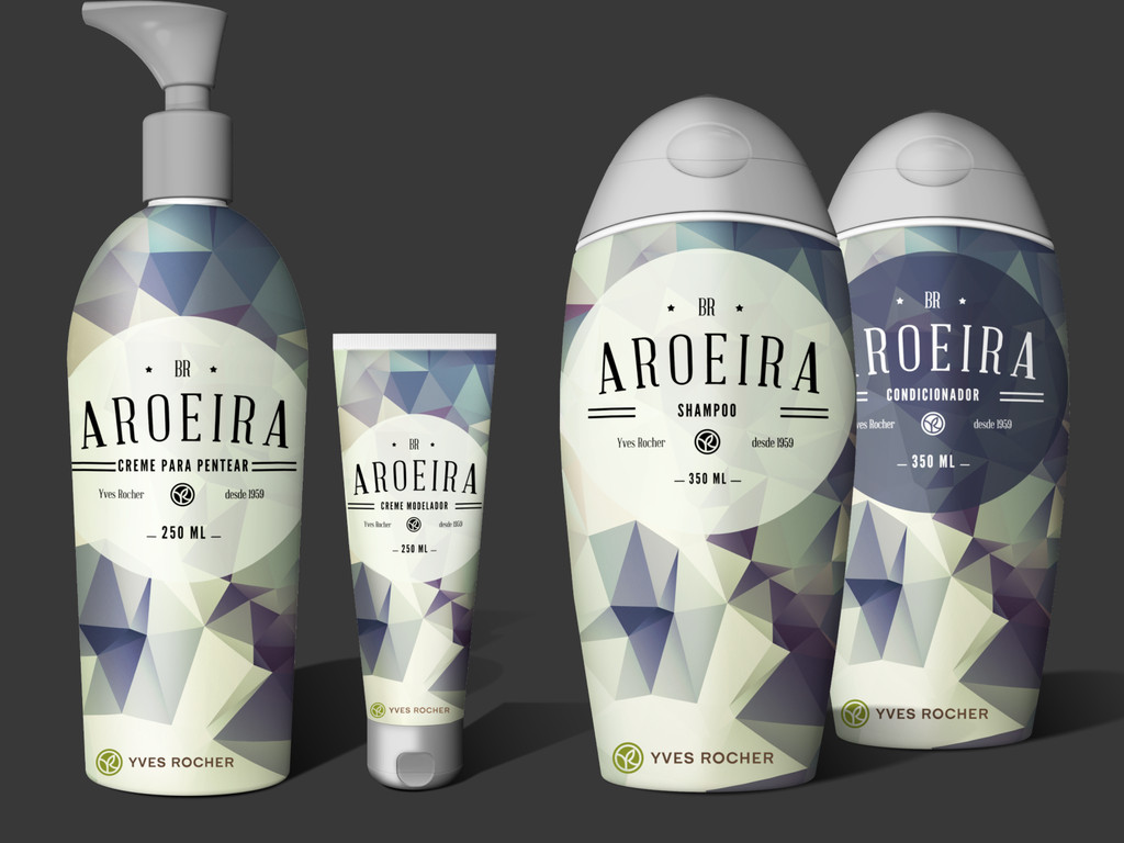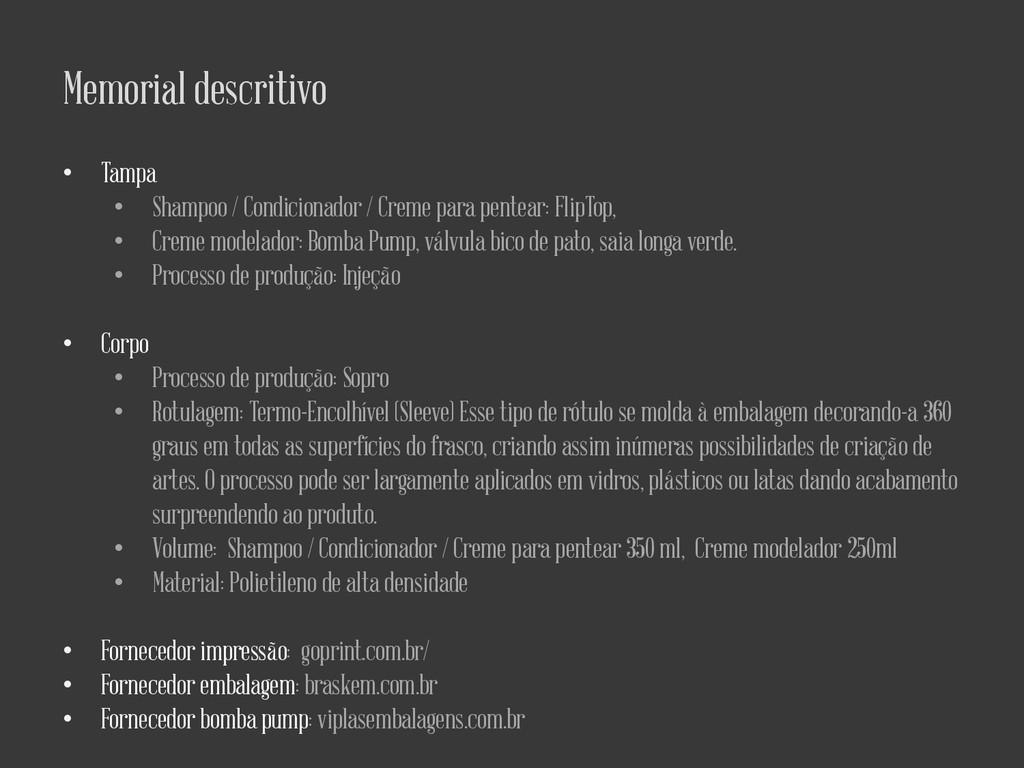 para pentear: FlipTop, • Creme modelador: Bomba Pump, válvula bico de pato, saia longa verde. • Processo de produção: Injeção • Corpo • Processo de produção: Sopro • Rotulagem: Termo-Encolhível (Sleeve) Esse tipo de rótulo se molda à embalagem decorando-a 360 graus em todas as superfícies do frasco, criando assim inúmeras possibilidades de criação de artes. O processo pode ser largamente aplicados em vidros, plásticos ou latas dando acabamento surpreendendo ao produto. • Volume: Shampoo / Condicionador / Creme para pentear 350 ml, Creme modelador 250ml • Material: Polietileno de alta densidade • Fornecedor impressão: goprint.com.br/ • Fornecedor embalagem: braskem.com.br • Fornecedor bomba pump: viplasembalagens.com.br