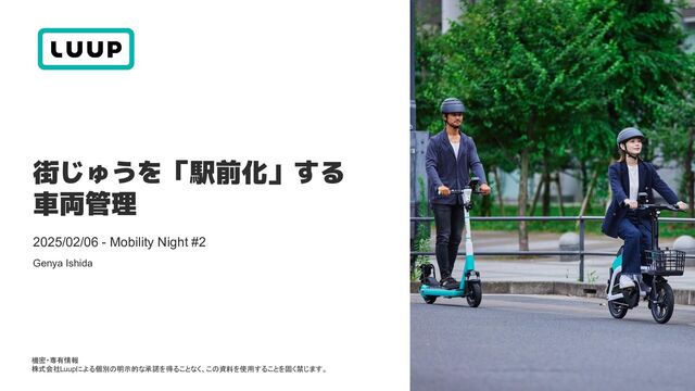 機密・専有情報 株式会社Luupによる個別の明示的な承諾を得ることなく、この資料を使用することを固く禁じます。 街じゅうを「駅前化」する 車両管理 Genya Ishida 2025/02/06 - Mobility Night