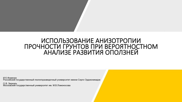 самостоятельный класс оползневых процессов. На развитие скальных оползней оказывают существенное влияние неоднородности (в виде различного типа и генезиса поверхностей р а з д е л а , н а п р и м е р трещиноватости). Без понимания механизма, структуры и роли ослабленных зон в устойчивости склона, любые количественные оценки устойчивости скальных оползней будут некорректными. Структура доклада В докладе будут рассмотрены следующие вопросы: • критерии прочности грунтов, позволяющие учитывать анизотропию, • влияние анизотропии прочности грунтов с к л о н о в о г о м а с с и в а н а р е з у л ь т а т ы количественной оценки общей устойчивости склона. • принципы вероятностного анализа с учетом анизотропии прочностных свойств грунтов. • возможность получения вероятностных оценок развития оползневых деформаций, что в дальнейшем может быть использовано при анализе геологического риска.
