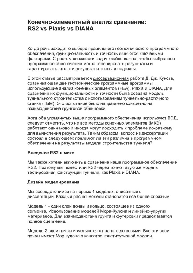 заходит о выборе правильного геотехнического программного обеспечения, функциональность и точность являются ключевыми факторами. С ростом сложности задач крайне важно, чтобы выбранное программное обеспечение могло генерировать результаты и гарантировать, что эти результаты точны и надежны. В этой статье рассматривается диссертационная работа Д. Дж. Кунста, сравнивающая две геотехнические программные программы, использующие анализ конечных элементов (FEA), Plaxis и DIANA. Для сравнения их функциональности и точности была создана модель туннельного строительства с использованием туннельно-расточного станка (ТБМ). Это испытание было направлено конкретно на взаимодействие грунтовой облицовки. Хотя оба упомянутых выше программного обеспечения используют ВЭД, следует отметить, что не все методы конечных элементов (МКЭ) работают одинаково и иногда могут подходить к проблеме по-разному для вычисления результата. Таким образом, вопрос из диссертации состоял в следующем: повлияют ли эти различия в программном обеспечении на результаты модели строительства туннеля? Введение RS2 в микс Мы также хотели включить в сравнение наше программное обеспечение RS2. Поэтому мы поместили RS2 через точно такую же модель тестирования конструкции туннеля, как Plaxis и DIANA. Дизайн моделирования Мы сосредоточимся на первых 4 моделях, описанных в диссертации. Каждый расчет модели становится все более сложным. Модель 1 - один слой почвы и кольцо, состоящее из одного сегмента. Использование моделей Мора-Кулона и линейно-упругих материалов. Для взаимодействия грунта и футеровки предполагается полное сцепление. Модель 2-слои почвы изменяются от одного до восьми. Все эти слои почвы имеют Мор-кулона в качестве конститутивной модели.