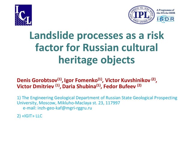 cultural heritage at the present time can be considered as critical. There is a steady decline in the cultural wealth of the country. According to various estimates, the state from 50 to 70% of the historical and cultural monuments that are under state protection is characterized as unsatisfactory, for most of them it is necessary to take urgent measures to save them from breakdown, damage or destruction. Over the past 10 years, more than 2.5 thousand monuments have been destroyed in the Russian Federation, including 2 thousand - under the influence of adverse natural and man-made processes and landslides have played one of the leading roles. The study of the landslide process within the historical natural-technical systems (HNTS) is concerned with great difficulties. Each architectural monument is unique as the natural conditions of each of them. The evolutionary transformations of the historical territories relief began with the construction of the first structures. This was expressed in the leveling of the territory and its adaptation to the requirements of economic needs. Over the centuries-long history of the HNTS functioning, the surface topography, as a rule, has changed very significantly. A change in the terrain entails a change in quantitative and qualitative indicators of engineering geological processes.