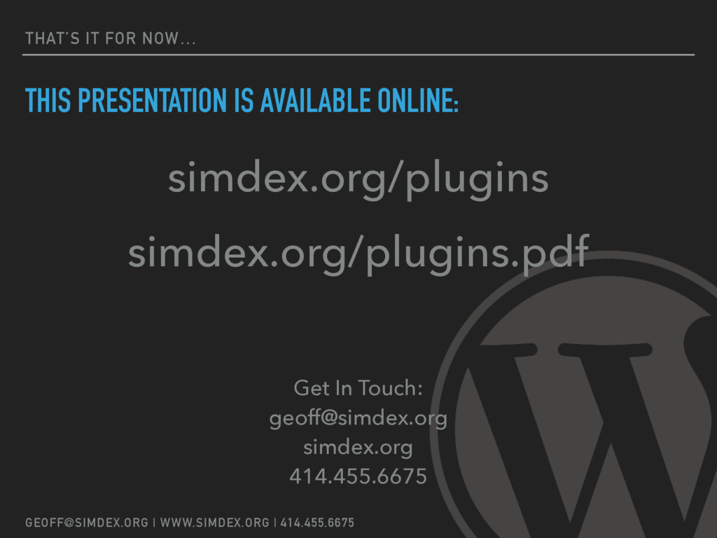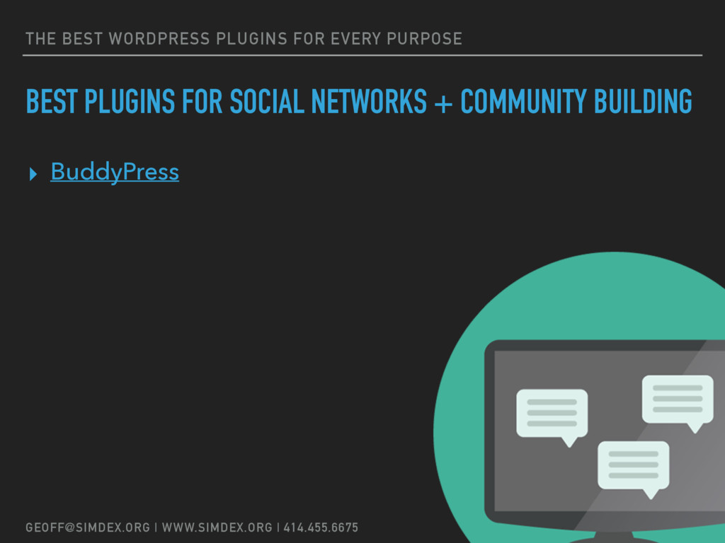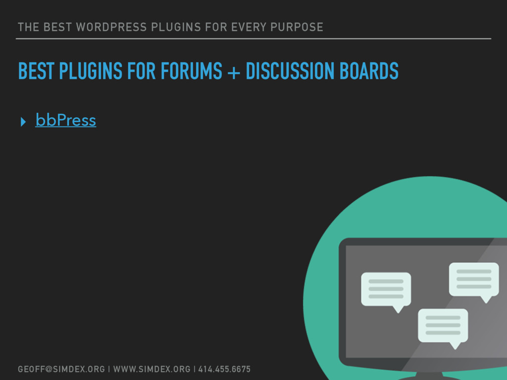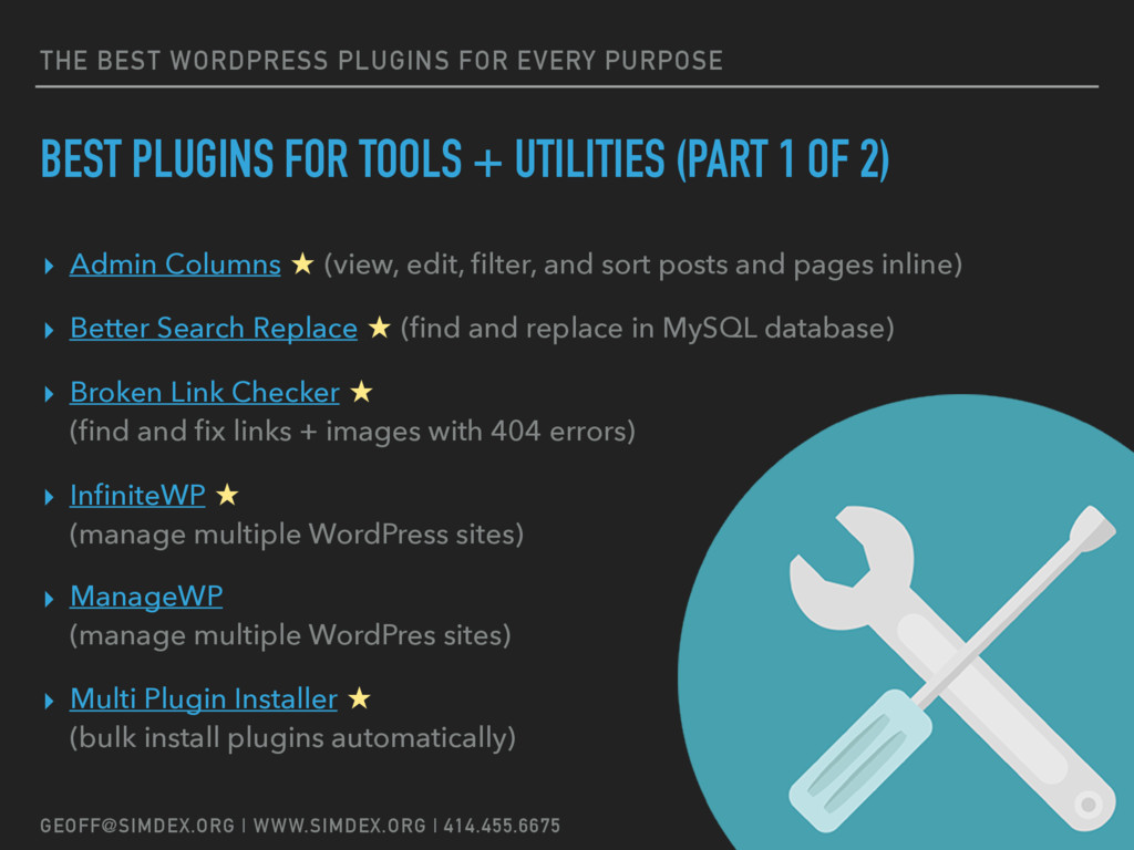 Geoff Myers, digital marketing consultant/strategist and president of SimDex LLC, will be presenting an overview of the best plugins that he – and many other WordPress developers – use regularly for client projects and highly recommend.