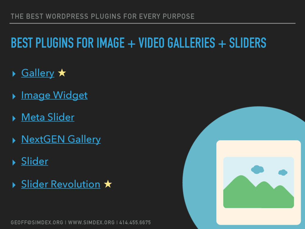 Geoff will present and discuss some of the best plugins available in each of the following categories: