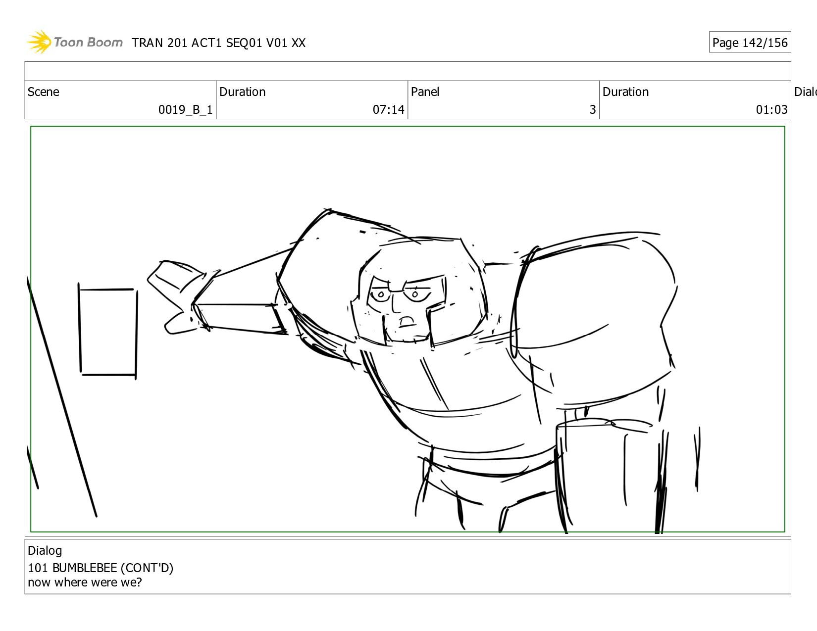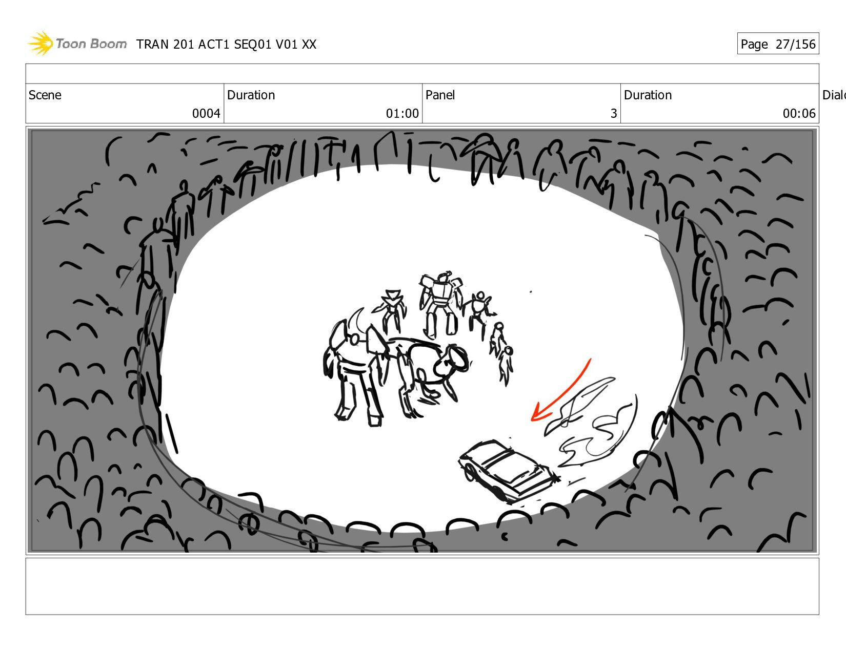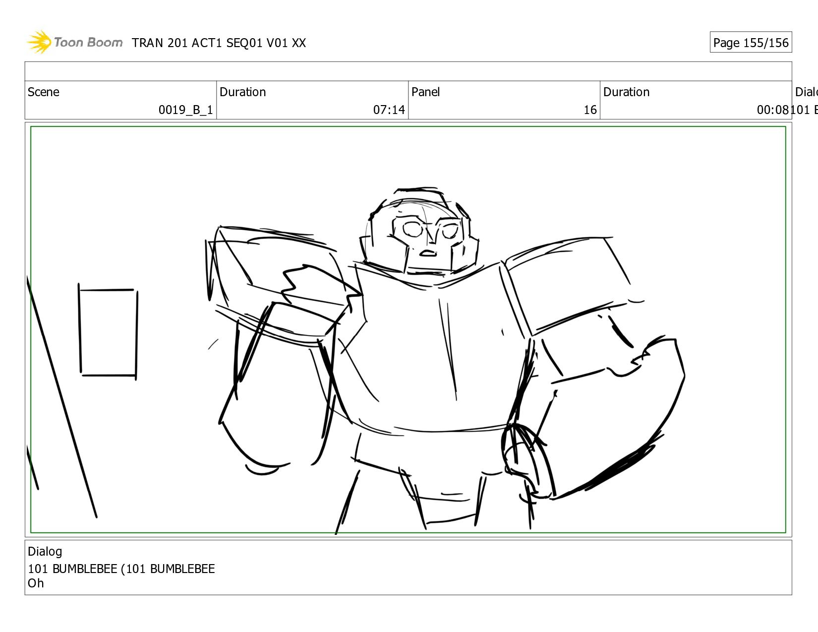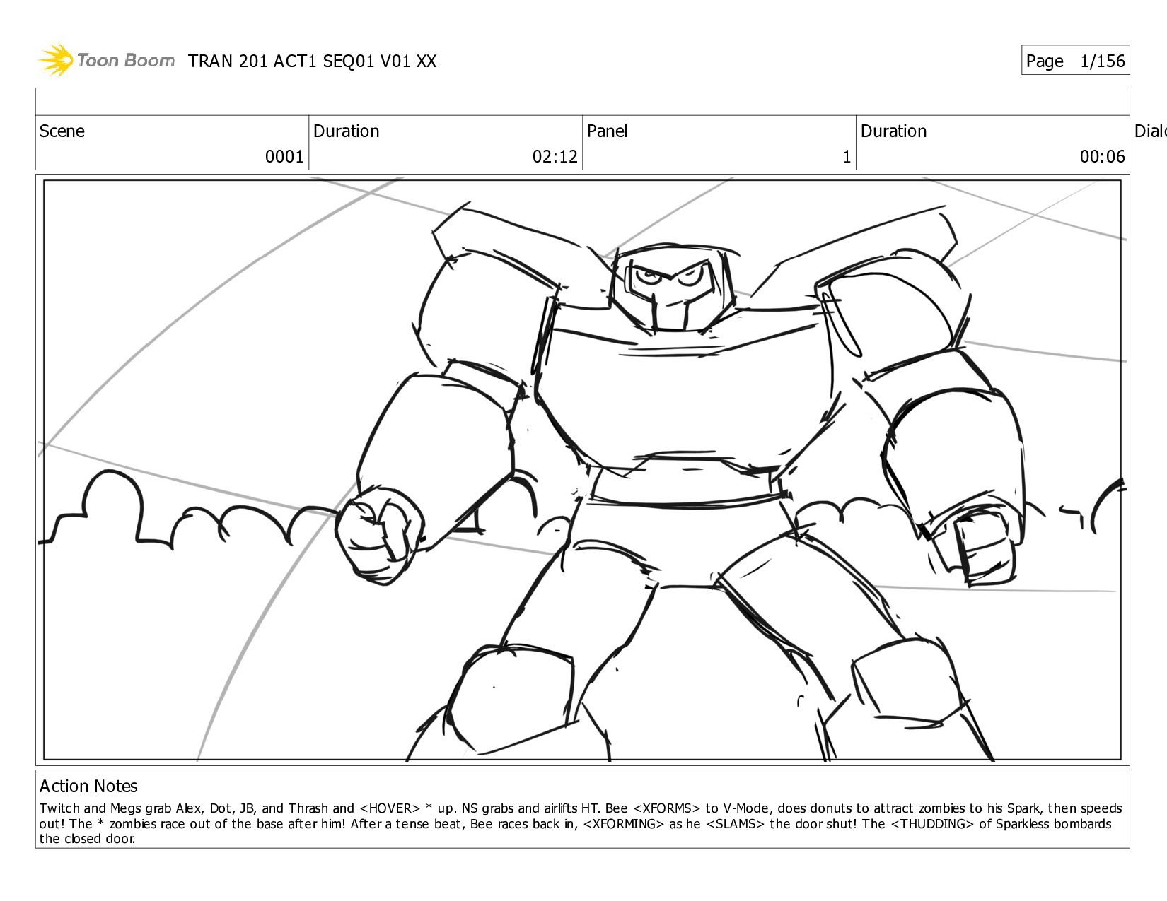 Notes Twitch and Megs grab Alex, Dot, JB, and Thrash and <HOVER> * up. NS grabs and airlifts HT. Bee <XFORMS> to V-Mode, does donuts to attract zombies to his Spark, then speeds out! The * zombies race out of the base after him! After a tense beat, Bee races back in, <XFORMING> as he <SLAMS> the door shut! The <THUDDING> of Sparkless bombards the closed door. TRAN 201 ACT1 SEQ01 V01 XX Page 1/156